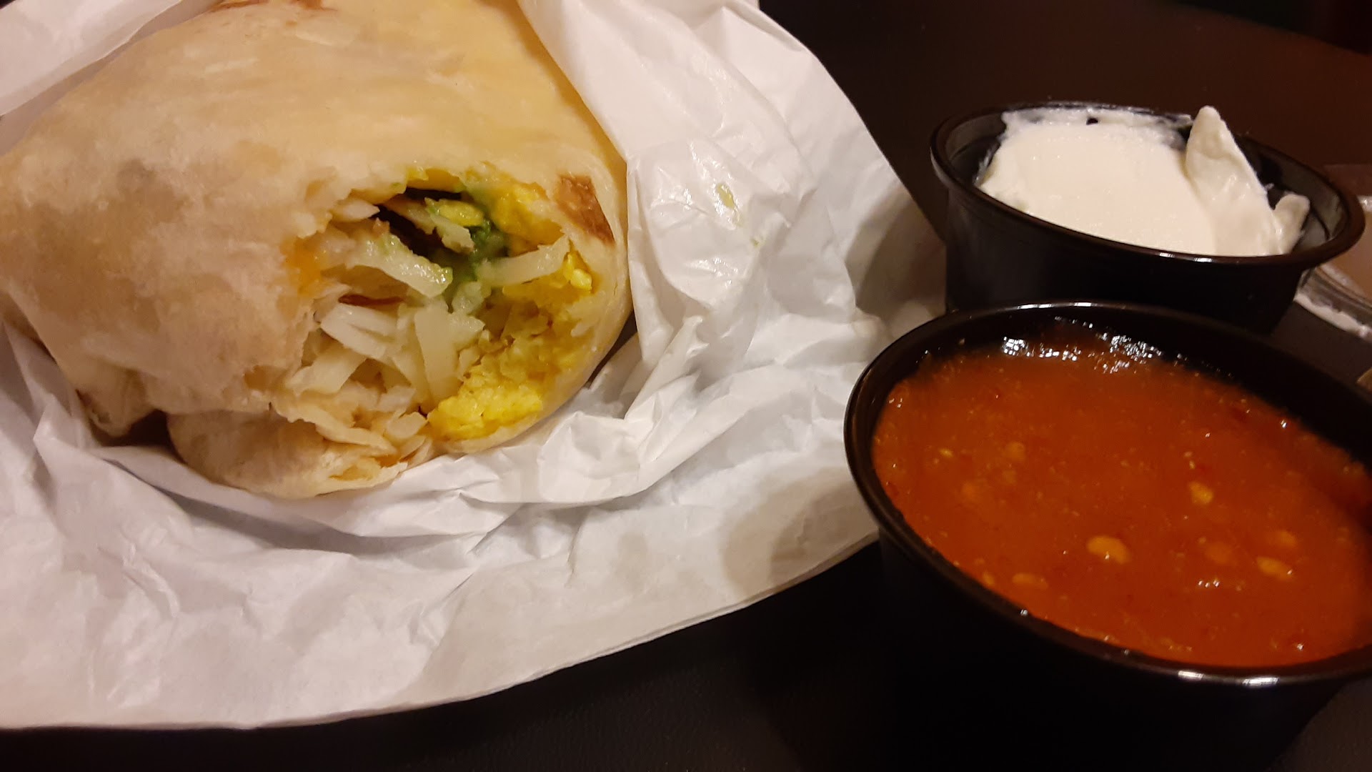 Breakfast Burritos come with scrambled eggs, hash browns, bacon, sausage & cheese. We inquired of the vegetarian option of Avocado in lieu of bacon AND sausage, but all we could do was remove the bacon and sausage from $10.59 burritos (w/ no price reduction) and add avocado for another $1.49 🥑. The best part of the breakfast burritos was the hot salsa 🌯