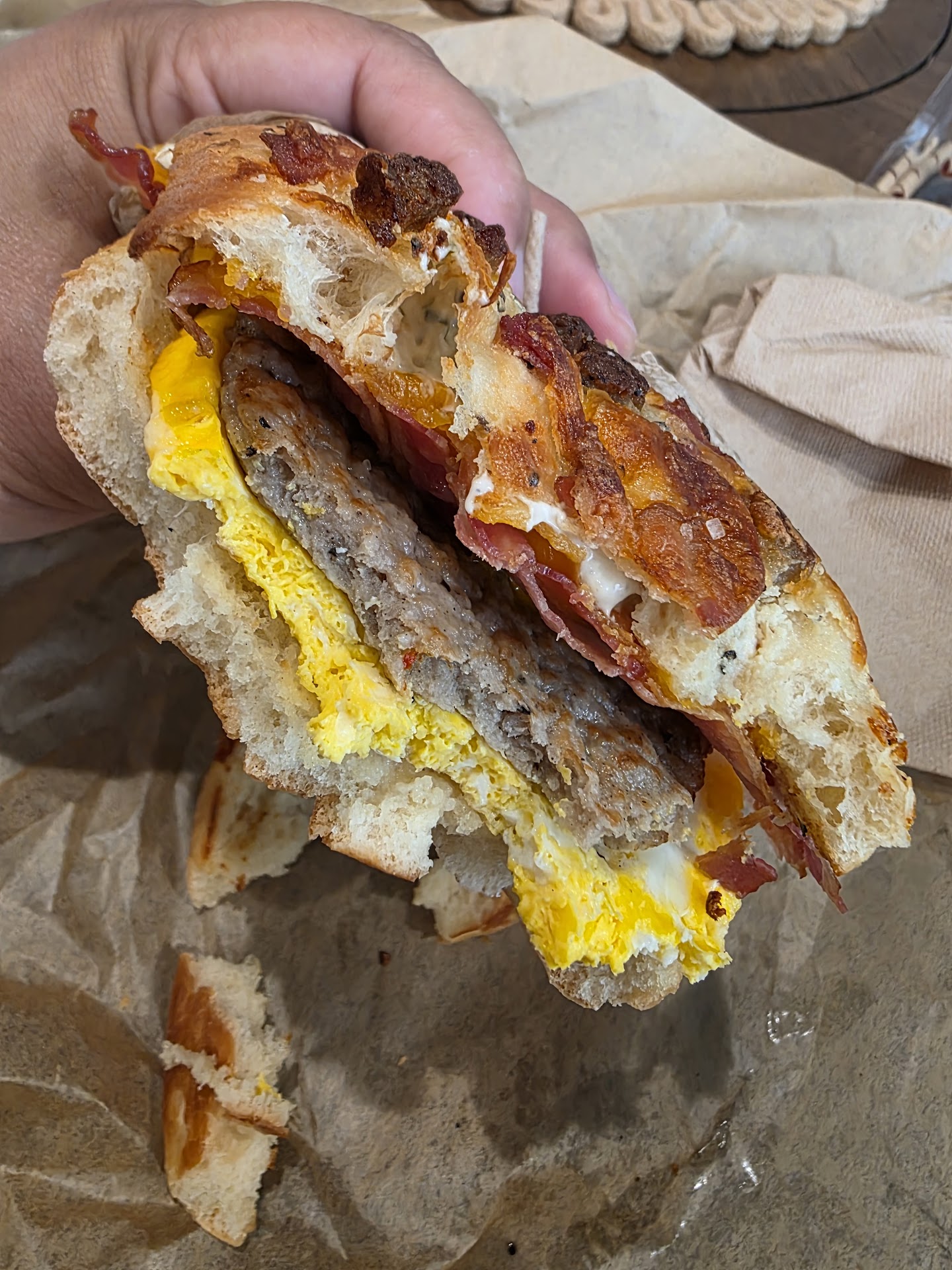 I don't usually leave reviews like this, but this experience was disappointing enough that I felt the need to speak up. My wife, our baby, and I stopped by Einstein Bros. Bagels hoping for a quick breakfast. While waiting, I noticed an employee wearing gloves while working the register -- handling cash and touching surfaces -- then immediately turning around to prepare food without changing gloves.