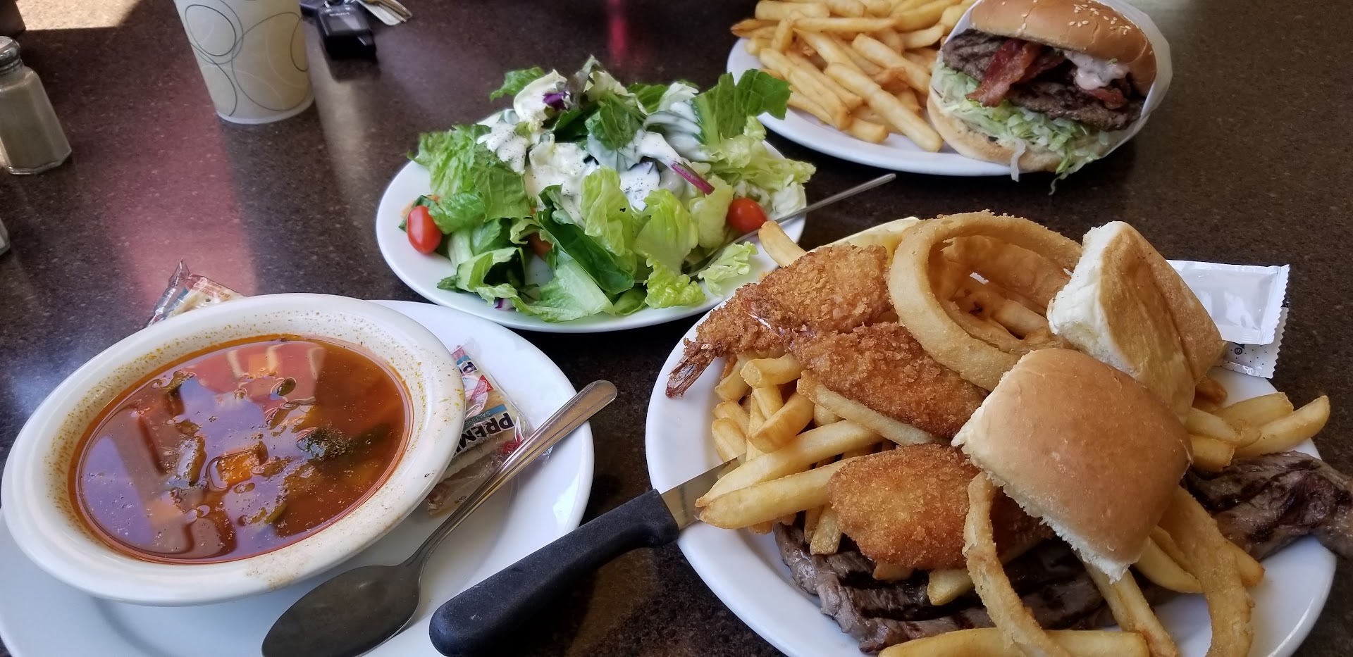 We've never been in that area before so I looked up what was around for a quick bite to eat. My husband was unsure of what he wanted so I decided on this place since they have a wide variety of foods to choose from. We didn't realize that it was counter service instead of table service but that didn't matter to us at all. They also have a drive thru, which I thought was kind of cool. I decided I wanted dinner and got the ribeye and shrimp meal. The dinners come with choice of soup, a salad, and a roll. You also get to choose from fries, baked potato, or mashed potatoes. The ribeye was really juicy and tender. I definitely wasn't expecting it to be as good as it was!!! For the price of my meal, I was expecting small portions. I was definitely wrong about that!!! My meal was around $11 for all of that! ๐ฎ๐ฎ My husband ended up getting the bacon avocado burger and he made it a combo, for like $3 extra, to get a drink and fries. The burger was really good and they definitely didn't skimp on the avocado. It took us a little while to order at the counter since we've never been there before. The woman behind the counter was super helpful and and very nice. She even came by to see how everything was, which she didn't have to do! I wish this place was closer to where we live since San Clemente doesn't have many diner style restaurants. If we are ever out that way again, we will definitely have to stop there. Our whole bill was a little over $21 and we ended up taking 3 large containers of food home because we didn't know it was going to be that much food!! Going to have leftovers for a...