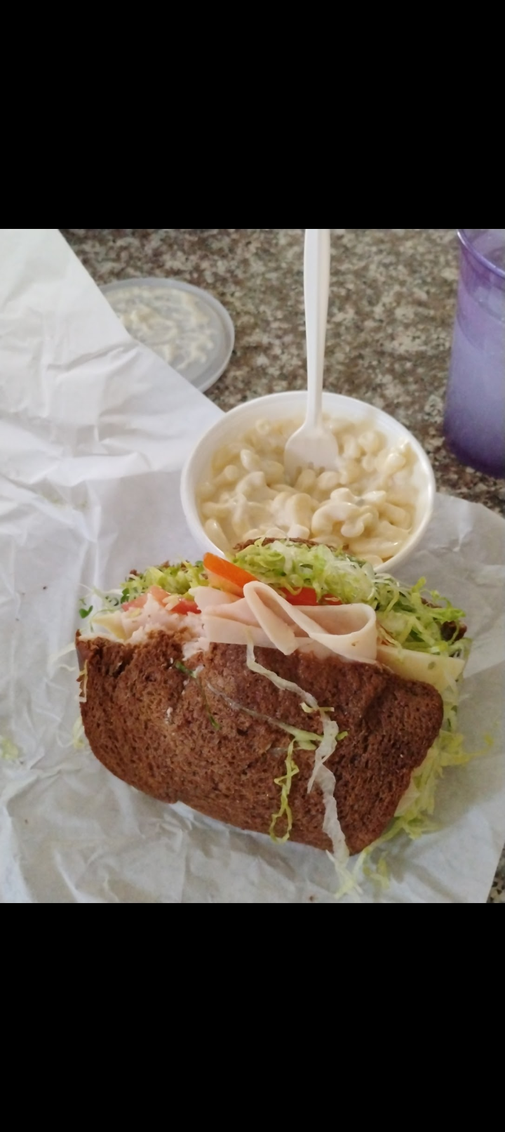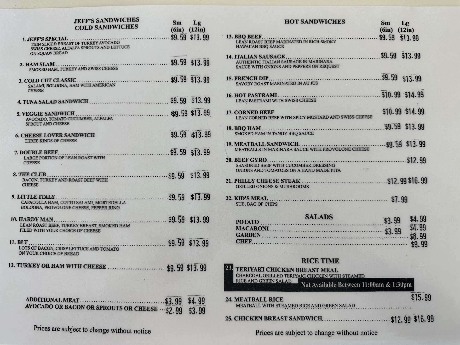 today i think my items were overpriced!! i paid 21.27 for a chicken salad,meatball sandwich with Bell peppers and a large drink when the chicken salad is 659 and so is the chef salad but what she did was charged me 6:59 for the chef salad and another 299 for chicken on it $0.49 for the Bell pepper on the meatball sandwich which it was already 7:19 ,1 99 for a large drink heres half the sandwich and the salad not worth it at all!!and the ham and turkey was slimy and the chicken was dry and they were super thin pieces!! not happy at all !!its usually alot better but the salad wasnt even half as big as farmerboys which is even cheaper.not happy with...