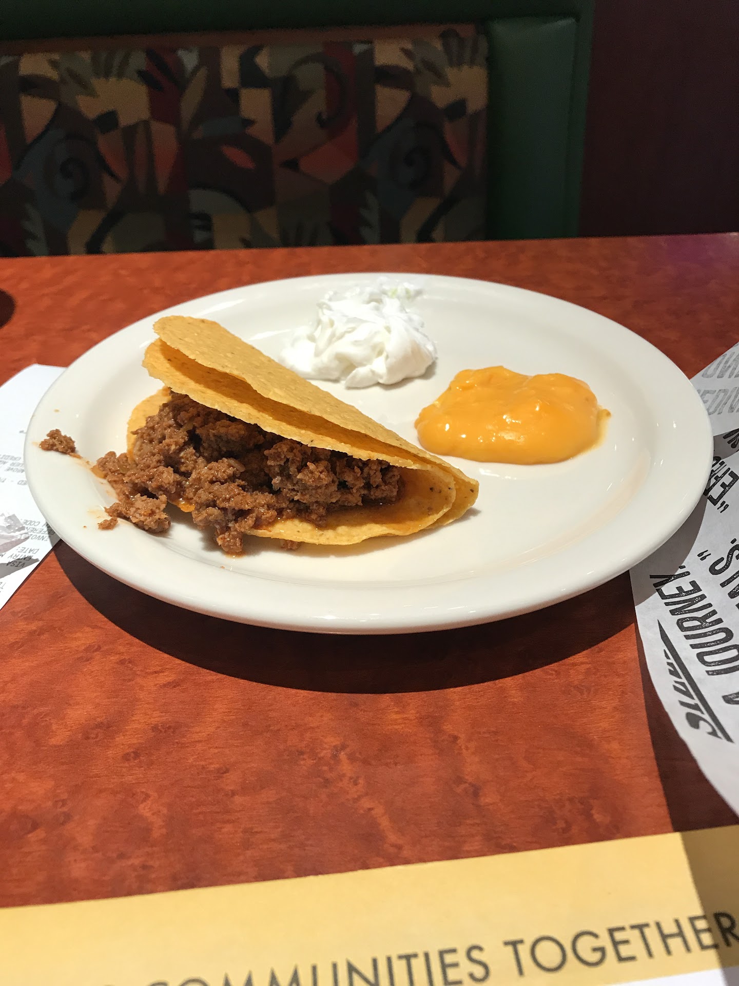 When I came today, they offered the following hot food options: 4 soups (clam chowder, menudo, vegetable beef, chicken noodle) chicken nuggets (good, taste like McDonald's nuggets) mini corn dogs potato wedges meatballs in marinara as well as bland, unsalted pasta on the side taco bar consisting of mystery meat (looked like jack in the box taco meat), taco shells, corn chips, corn tortillas, guacamole, sour cream, watery queso, rice, beans