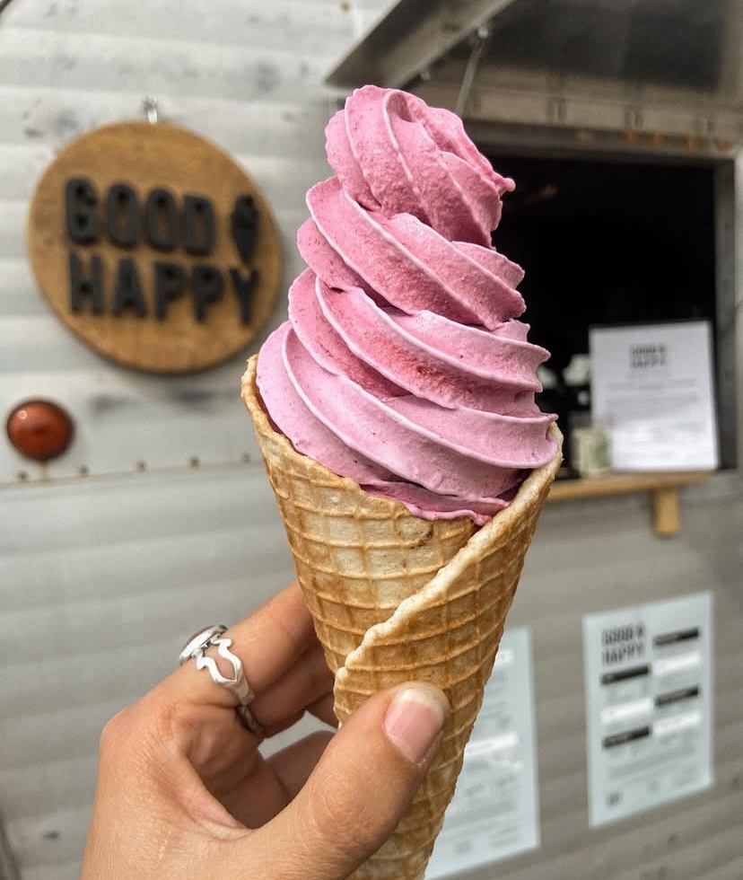 Good & Happy Ice Cream Co located in the cutest little remodeled trailer next to Pauls Patch on Utah's Famous Fruit Way is serving up New Zealand style ice cream. I am NOT a soft serve gal, but this is nothing like that. They take hard Aggie Ice Cream and add whatever fresh (frozen) fruit and other mixins you choose and it turns it into the most luscious soft ice cream treat, with the most incredible texture! And how did that ice cream not instantly begin to melt in this heat after Alex (the owner) handed it to me? DO NOT miss out on the added flavor bomb of her fresh waffle cones either-there’s a subtle flavor in it I can’t quite pinpoint (maybe cinnamon or cardamom) that adds even more to the experience. I got the vanilla base with raspberries and dark chocolate-the chocolate gets blended into fine pieces that are so appealing in the ice cream.