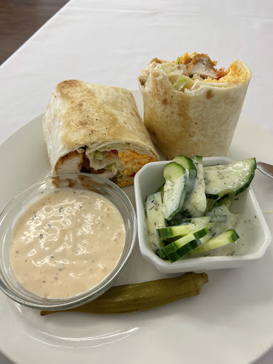 Read morei am not a fan of pimento cheese but this homemade pimento cheese was really good! The whole wrap was good. It’s the mutha clucker wrap. Chicken tenders with candied jalapeños, pimento cheese and a dipping sauce of a ranch blended with other flavors. I could’ve gone without the dip it was good. I think there could have been more jalapeños tho. I LOVE how they toasted the exterior of the wrap, perfect texture. The cucumber dill salad was good too, a little too much sauce but good flavor. My mom ordered the chicken salad croissant and said it was really good too. She had the pasta salad as her side. It didn’t look like much of a pasta salad, looked like just noodles but whatever was on the noodles was really yum! The wrap was big and I was definitely full! Great southern restaurant. Exactly what you would picture in downtown Perry. I took a couple of bites before...