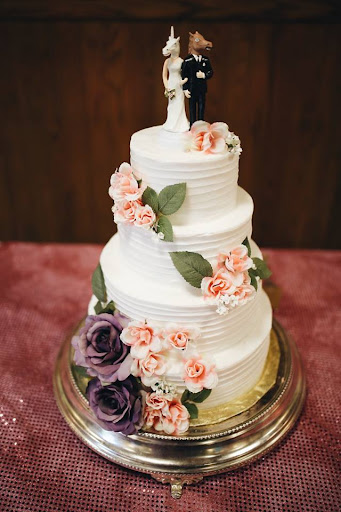 I went to drop off the cake topper and also ordered some vegan cupcakes and gluten free cupcakes (in some of the same wedding cake flavors that my sister chose) for guests with special dietary needs. Easy peasy. What I also dropped off were a vine of pink flowers and a couple single purple flowers that we picked up at the craft store. When my sister picked them out, I liked the flowers but could not imagine them on the cake. I trusted Erin and her crew though so left it in her hands to figure out how to cascade them down the tiers. Lucky me, I bought myself some more gluten free chocolate chunk cookies while I was there. They're my absolute favorite things!