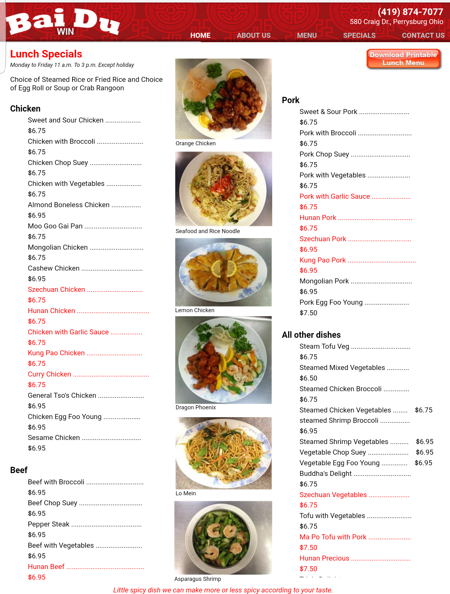 Read moreI'd always heard glowing things about Bai Du, but because they didn't have much/any info available online until only recently, when a hankering for Chinese food came about I'd always happily concede to Ya Ya Kitchen. Anyway, going for dinner on a Friday you'll most likely find it to be pretty busy, so calling ahead is highly recommended. You should acknowledge that you'll have to wait a bit for your food, as this is a pretty small operation that's in high demand, so that's just how it is. The food is very reasonably priced, and when it arrives you'll find that it's more than worth the wait. The portions are that perfect kind of huge that guarantees you'll be taking an additional meal home with you (remember, though, when reheating rice you should include a mug of water in the microwave, which will prevent it from getting too dried out). Their chicken egg rolls are delicious, and their cashew chicken, like all cashew chicken, is absolutely...