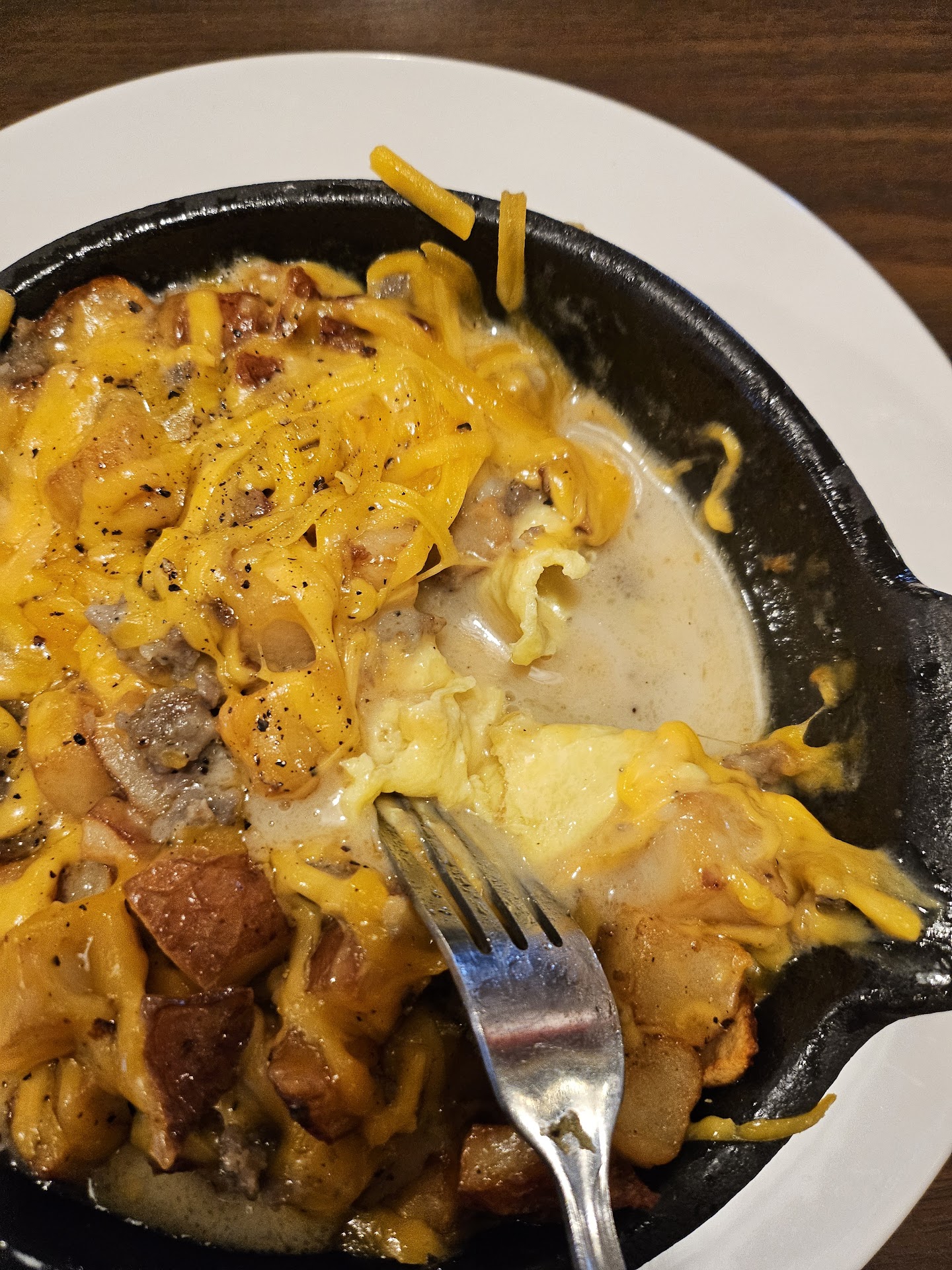 Finally, at around 11:40, we got our meals. One of which was completely wrong (ordered a cheddar & bacon omelet with home fries and got scrambled eggs, hash browns and sausage links), so it was sent back. Fortunately it was corrected a couple minutes later, by the manager... who offered no apology. Just swooped in, took the plate with the wrong meal, replaced it and was gone.