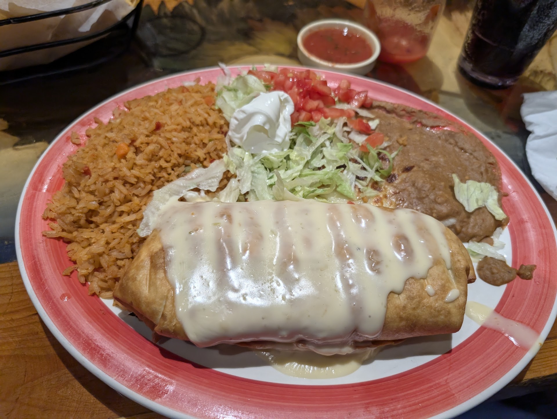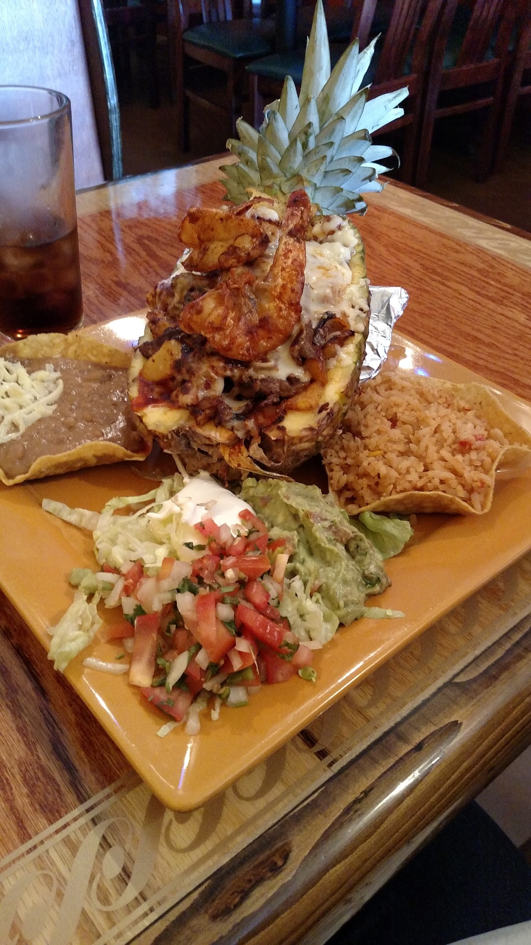 Read moreFirst visit here on a whim. The food was delicious but not perfect. My chimichanga with fajita shrimp had large chunks of green pepper in it. I wish I'd known because I would have ordered something different. There were plenty of shrimp inside the chimichanga which almost made up for the green pepper. Why can't places use RIPE peppers: the red bell peppers. Sweeter taste and easier to stomach. At least the green pepper was cooked or I would have sent it back. The queso blanco that covered the chimichanga was amazingly delicious. Grilled shrimp with cheese on it? I never expected to enjoy it so much. The rice is okay but tastes like it's seasoned with a packet from the store. The refried beans were tasty but I tasted animal fat so they're not vegetarian friendly. Shrimp are fat free and they wouldn't have used them to make beans. Their chips are standard but better warm. The salsa is mostly runny with minimal chunks. The reducer cap was missing from the bottle of Tapatio on the table and I accidentally filled my salsa cup with hot sauce. I got an empty cup to start over.