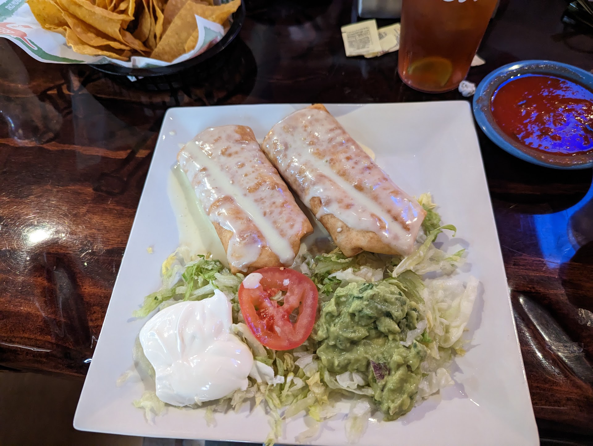 This is a nice restaurant located in a strip center, so parking isn't an issue. The restaurant was busy (Saturday evening) and we had to wait about 20 minutes to get a table. The dining facility was a little cramped around the bar area which was located on the left side of the entrance, but given the time and day that is to be expected. The interior had multiple TV's and game machines giving the restaurant more of a bar & grill feel to it versus a traditional Mexican restaurant. The cultural decor was pretty sparse, but the restaurant itself was clean and organized. After being seated our server took our drink order (water only) and brought them out quickly along with a serving of salsa and chips. The water was pretty neutral which is always nice, the chips were lightly salted, had good crunch, but didn't have much corn flavor. The salsa had a medium complexion, but was weak, tasting more of tomato than anything else. Our order took about 15 -20 minutes and was plated nicely. The grilled vegetables were very good as they had good flavor, texture and were cooked at the right temperature. The beans were also pretty good. The guacamole was firm and had decent flavor and complemented the other vegetables well. The slice of tomato served with both meals were not good as they were probably of the hot house or hydroponic variety. The enchiladas were nearly flavorless and all 3 (beef, chicken and cheese) had the same texture. The green chili sauce was slightly sour and had no real chili flavor. The cheeses used for the cheese enchilada were very mild and had very little stretch or creaminess to it. The service was very good with our server checking in just enough to not be a nuisance and show good hospitality. The portions were fair in comparison to the price so there was fair value. The food isn't going to offend many people, but I prefer Mexican fare that is spicier and more flavorful. This is a good, safe choice for families or anyone traveling through the area that wants a meal that isn't going to be too heavy...