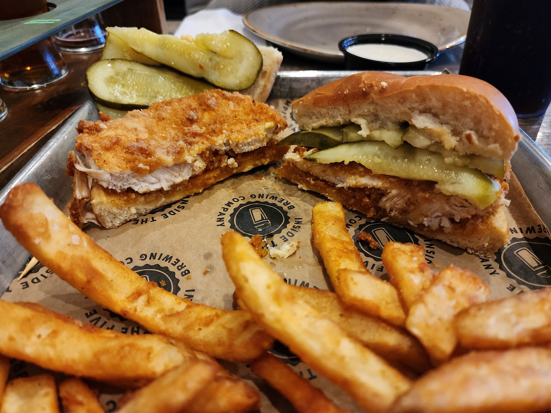 As for the food....we went on a Sunday, and it was before 2 p.m. So it was a limited Sunday brunch menu. My wife and I split the Nashville hot chicken sandwich. We have very different views. Lol. She loved it. On the other hand, I didn't care for it at all. I thought it had very little flavor, and there was nothing really hot about it. The only real taste was the overabundance of pickles that was on it. The chicken was tender, but that's about all. Like I said above, my wife loved it, though. We ordered the french fries with it, and those had a good flavor. They were seasoned well and crispy on the outside yet soft on the inside.