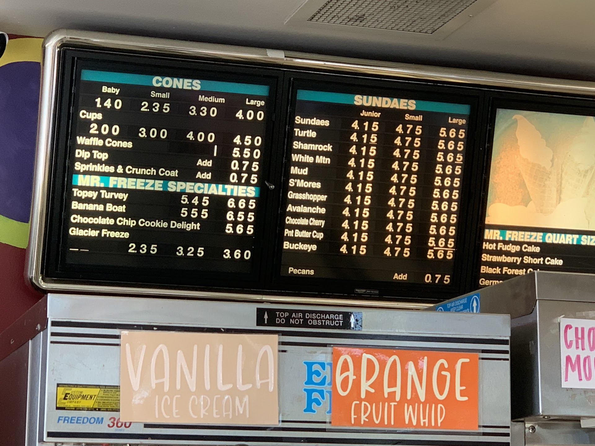 Mr. Freeze is great. The menu is pictures up on the glass where you order - others have posted photos of that here, so take a look. Otherwise you can ask the friendly staff to steer you in the right direction. I went up and said I like peanut butter and chocolate and hate fruit flavors in my desserts. Thus I was introduced to the Buckeye Sundae. If you get a junior itās enough ice cream for an adult, but a small sundae has the distinct advantage of topping at the top and bottom of your sundae. Itās amazing, and even though itās a lot of ice cream, the quality of toppings at the bottom canāt be beat.
