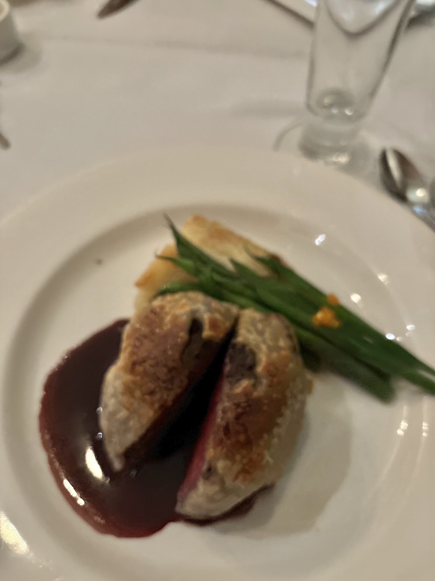 I ordered the filet which was approximately $12 dollars more expensive than their menu posted online. I asked for it pink, and while the center of it was tasty, the ends were brown and extremely dry. It comes with potatoes, green beans, and soup or salad. If I had to estimate, the dishes were plated prettily, but I think I had literally eight green beans. The portion of potatoes was also comical, maybe four bites. The salad is similar to the organic boxed mix I buy at the grocery store with some halved grape tomatoes and cucumbers.