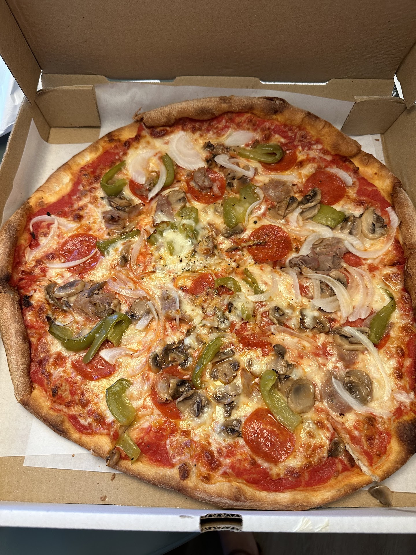 Ordered here while staying at Great Wolf Lodge and wanted to see what the hype was all about. And let’s say the pizza is DELICIOUS. The pizza tastes authentic and homemade. My family loved it and will certainly be coming back there while staying in the area ! Ordered “The Special” and a pep ! Everything is fresh and didn’t take long !