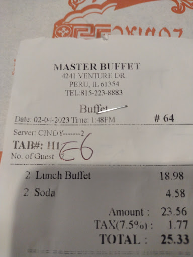 Read moreSo I was passing through town and I came across this restaurant called Master Buffet. So I stop off to try the food to see if it was worth it or not. First off I want to say as soon as I walk through the door I was amazed how nice it looked inside. It had a feel about it that made you feel really relaxed. So I was greeted and I was led to a table , but acourse they gave me one of those wobbly tables. But it was okay as far as the servers go they have a long ways to go to learn the meaning of professionalism and customer service. They were really lazy unprofessional and I highly recommend them teaching them the meaning of customer service. Now as far as the food goes the food was pretty amazing they had a variety of foods to choose from. The food was hot and The Taste was very good so I have to say is definitely a thumbs up for me and I highly recommend this to anybody passing through to stop off and try the buffet I would have to say it's worth it especially per person is only $15 plus tax I will be posting pictures so you can kind of see how...