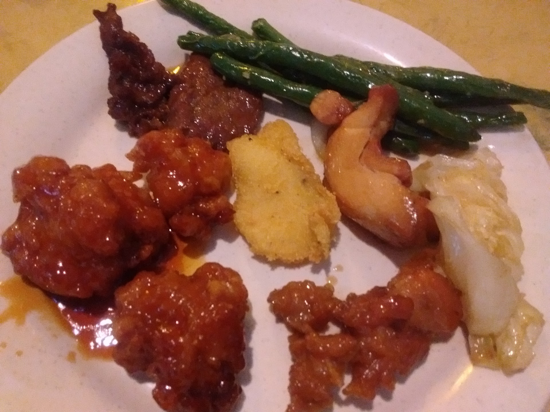 The service was friendly and my iced tea stayed topped off. The bar didn't match this experience; food was sparse and cold. I couldn't put my finger on it, but the egg drop soup just tasted... wrong. I don't know if it was the base or the stock, but I found the flavor unfamiliar and unpleasant. The hot and sour soup was the same way.