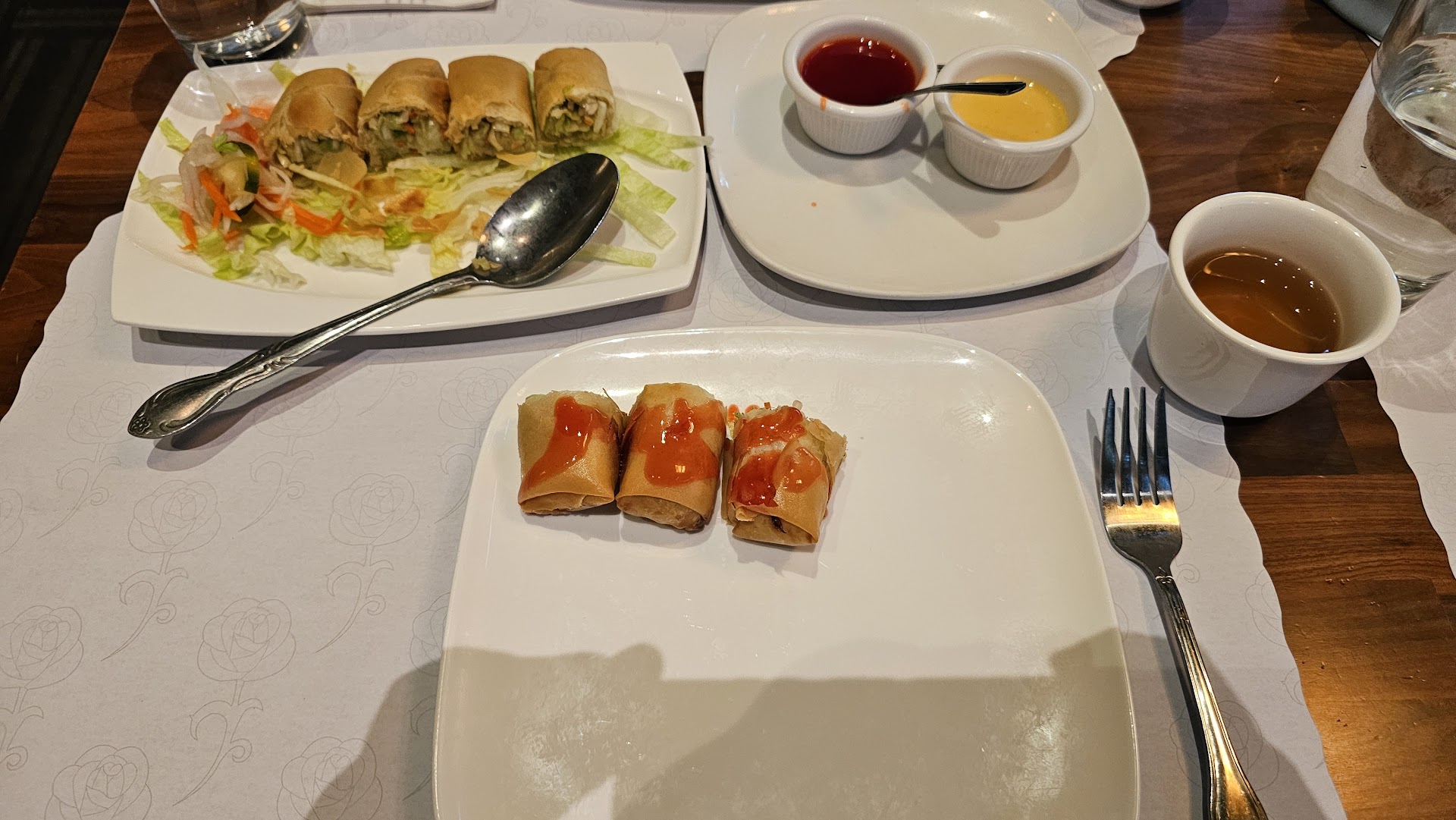 For starters, we ordered the Crispy Spring Rolls, which are shown in the first photo. They came out hot and crisp, served with sweet and spicy sauces on the side. The rolls were light and not greasy, which is sometimes an issue at other places. Along with the appetizer, they brought out a pot of hot tea, which was actually very good—a nice touch that added to the experience.