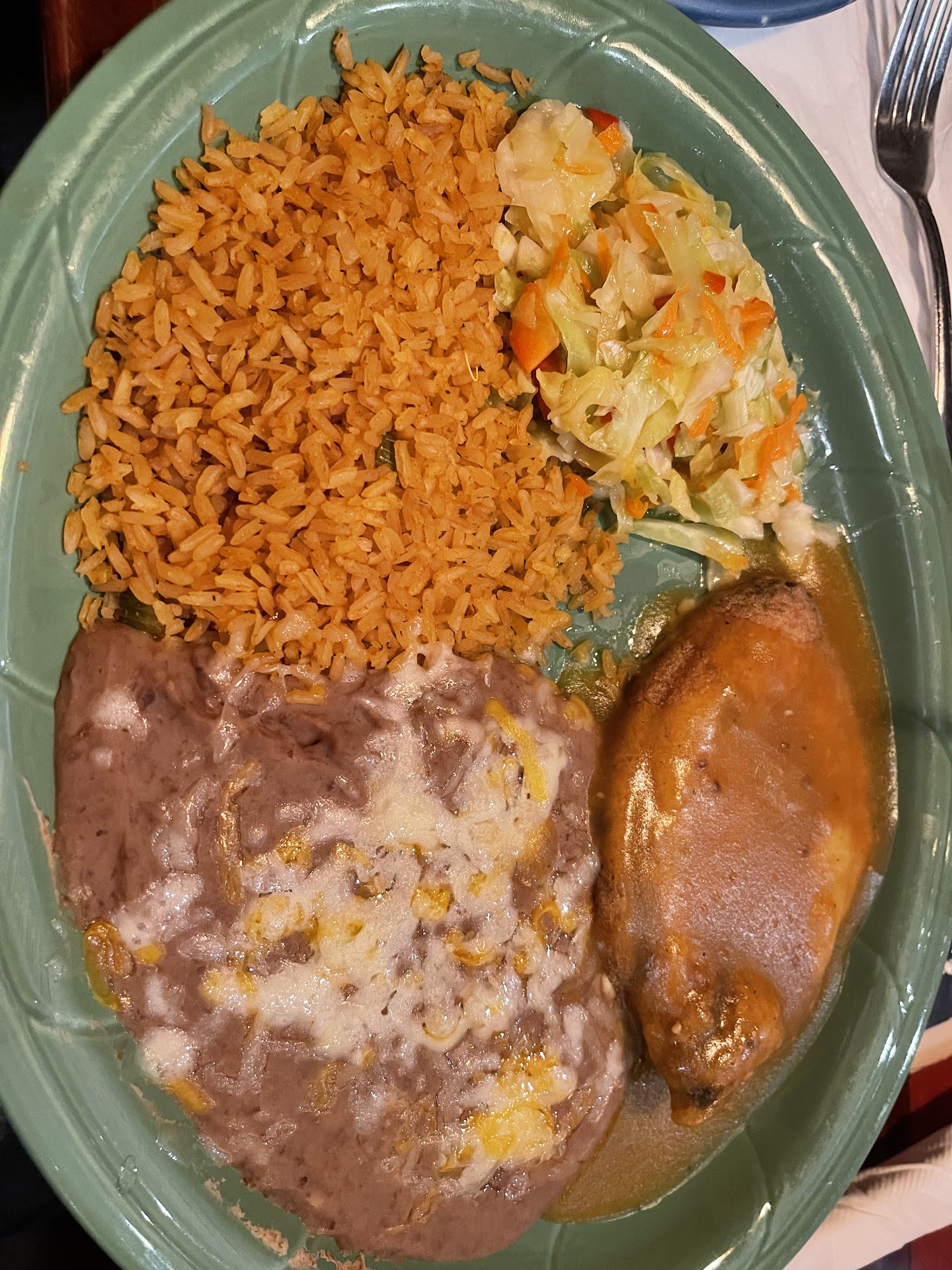 The main letdown was the food quality for my wife's combo plate. Her chicken taco came in what tasted like a pre-manufactured, Taco Bell-style shell rather than a fresh-fried one, which was disappointing for a dine-in restaurant. The cheese enchilada was barely warm, and the cheese inside was still cold and solidified, not melted and gooey as expected. Additionally, the combo plate came with what they call "coleslaw". My wife found it very out of place and unpleasant, noting a strong flavor of horseradish and vinegar. It was also plated in such a way that it spread onto other items on the plate. My carne asada chimichanga was decent in flavor but significantly smaller than any chimichanga I've ever received at a sit-down Mexican restaurant, feeling more like an appetizer size.