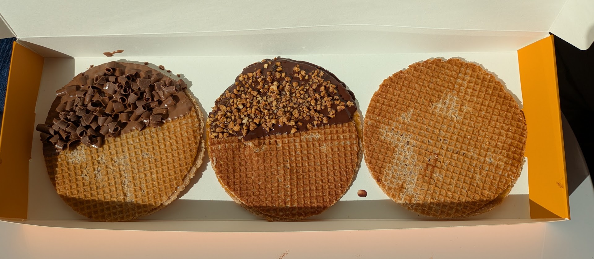 We ordered a three pack, our choice of three: plain, chocolate, and nuts. The stroopwafels were delicious but I did wish there was just a tinge more carmel in-between, but still good.