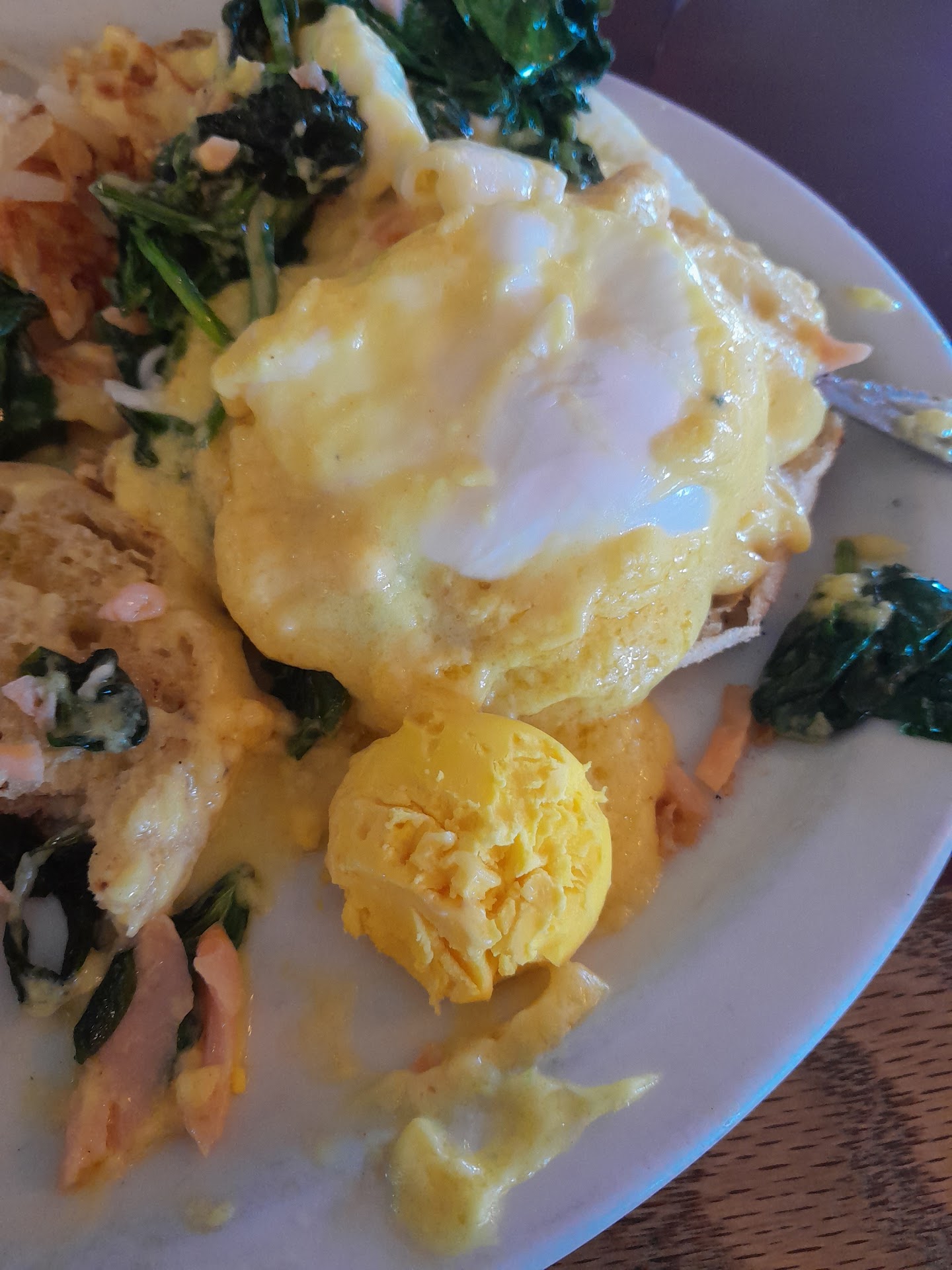 Well I'll start off by saying I was excited to return to Henny considering I'd be in town for a concert and had been here once before, and really enjoyed it. It was Sunday morning around 10:30 so I of course expected it to be busy. I waited at the door for maybe five minutes (no problem there). I get seated at the counter with no menu, I figured someone would be coming by and see I have no menu and offer one,..nope. Five minutes into me just sitting there a woman stopped by and said ill be right with you,...five minutes later still no menu. So finally I got up and grabbed one myself. Starting to get somewhat annoyed I reminded myself that they are busy and to just be patient. About four minutes later another woman approached me asking if I'd like something to drink (finally someone noticed me just sitting there). Finally I got an iced tea but then I waited there another 10 minutes still nobody coming by to take my order. Deep breaths...lol...they are busy (I keep saying too myself). FINALLY (almost 25 minutes) after sitting down a gal noticed me and asked my waitress to take my order. Happy that someone noticed, I'm thinking okay this the last of my having to wait (wishful thinking). She takes my order, I order the smoked salmon benedict with my English muffin toasted crispy. I do that because the muffin tends to get soggy due to the water from the poached eggs. I also ordered one pancake. Yay, we are on our way. I sit back and read the news on my phone... about 10 minutes in I'm thinking okay where's my food? I look up and see another patron who sat down at the same time I did getting up to leave....now I'm seriously annoyed! Still another 10 minutes and FINALLY my food arrived. Ready to dig in my food is luke warm.....my poached eggs are so overcooked they are like they are like hard-boiled eggs. My English muffins are wet and undercooked. My pancake cold🤦♀️. She had just dropped off my food I stopped my waitress and asked her if she would get me a new pancake cuz mine was cold, she's like aren't you sure you don't want me to just heat it up in the microwave...now im officially angry...NO I WANT A FRESH ONE!!! I got halfway through the meal and just gave up. I went to the counter and told her I needed my check to pay my bill once again had to wait about 5 minutes. Worst...