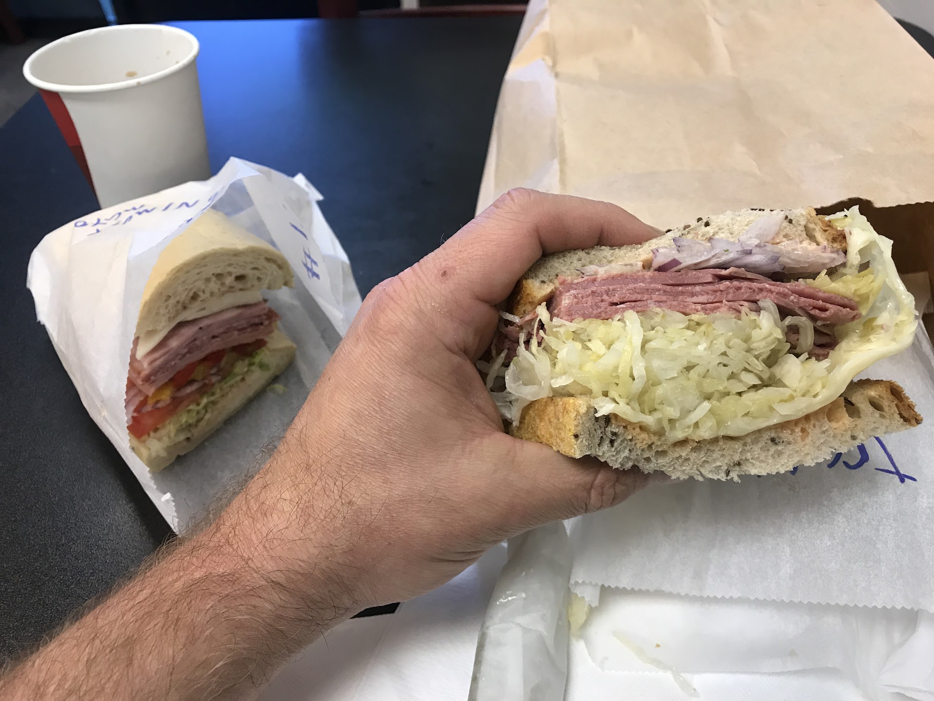 The sandwiches are dense, but they gave me only like 2 singular napkins... which i get why, they arent terribly messy sandwiches, which is good I suppose. Im a saucy person so I dont mind messy sandwiches.