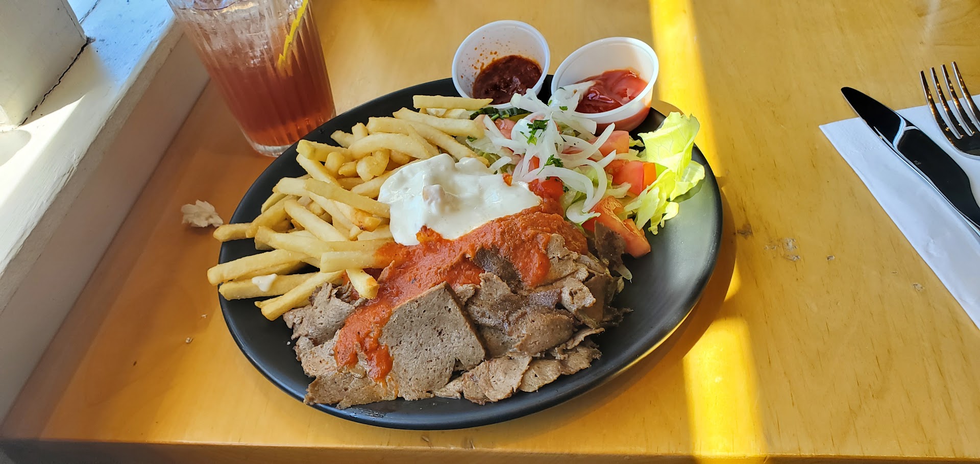 The kebab plate with lamb and fries was very good! The lamb was tender to the bite and seasoned very well. The fries were crisp and salted nicely.