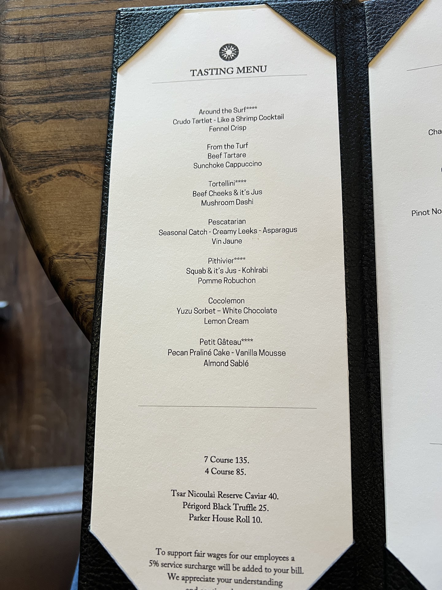 We had a their prix fixe 7 course meal without the wine paring. The courses were each different, appropriately sized, and brilliantly seasoned. Their sauces are just exceptional. We had halibut, steak tartare, shrimp, squab, etc. Each as an entree sized plate would have made for a legendary meal. By the end of the meal we were happily full but not vastly over fed as is sometimes the case with prix fixe meals.