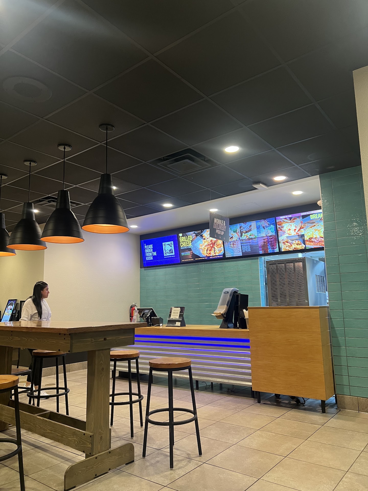 I enjoyed dining in at this Taco Bell because of the Spanish style, adobe-like building. This Taco Bell was also clean and very up to date with their technology since youâre required to order through a kiosk. Personally, Iâm not a huge fan of not having an option to speak to a person rather than a machine especially because you can at other Taco Bellâs. I did like the set up inside of the Taco Bell. They have stools and a high table as well as many booths. The tvâs they have behind the counter are on the newer side which is nice because it makes the images brighter and easier to read. They also have a cool purple lighting in front of the counter which makes for a modernistic and techie look.