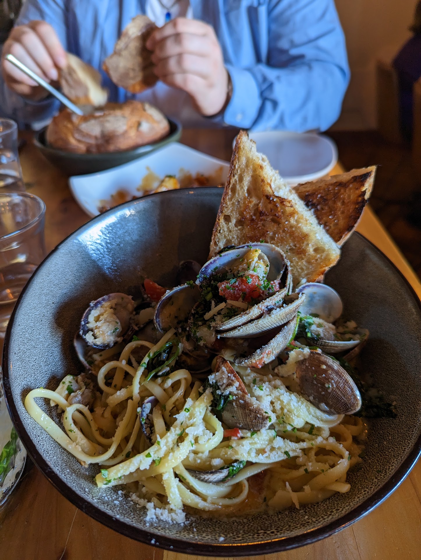 The waitress made sure we got our order in before the happy hour ended, so we selected some appetizers. The oysters were good, the bread and garlic fine. We however did not get the calamari we ordered at all throughout the meal. It was a misunderstanding, no harm but I would have liked to try them.