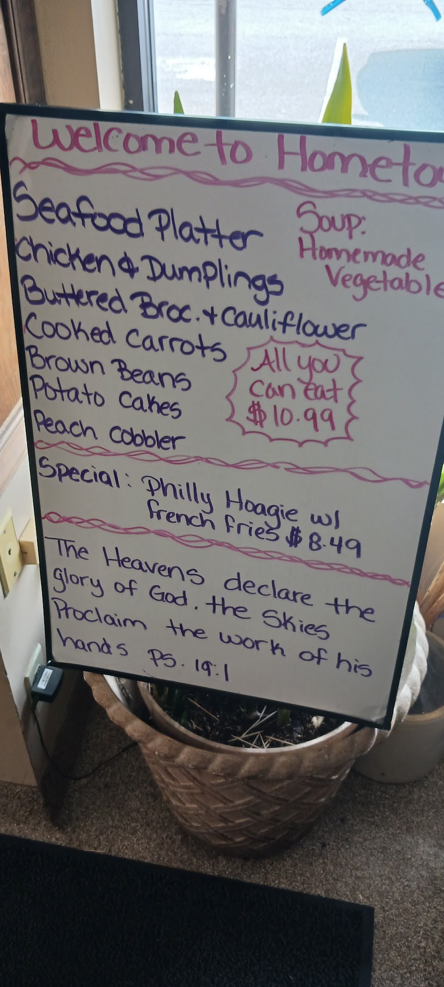 ย ย ย Read moreI want to say it is great because it is a small restaurant in a small town, but my experience was not great. My parents had the buffet, and I ordered a corn dog and fries. My parents had eaten from the buffet twice, plus their dessert, when I was finally able to flag down the waitress to ask about my food. She said she would check. Comes back out and says they are working on it. A family that came in at least 20 minutes after us ordered from the menu and got their food quickly. I ended up telling her to cancel my order.
