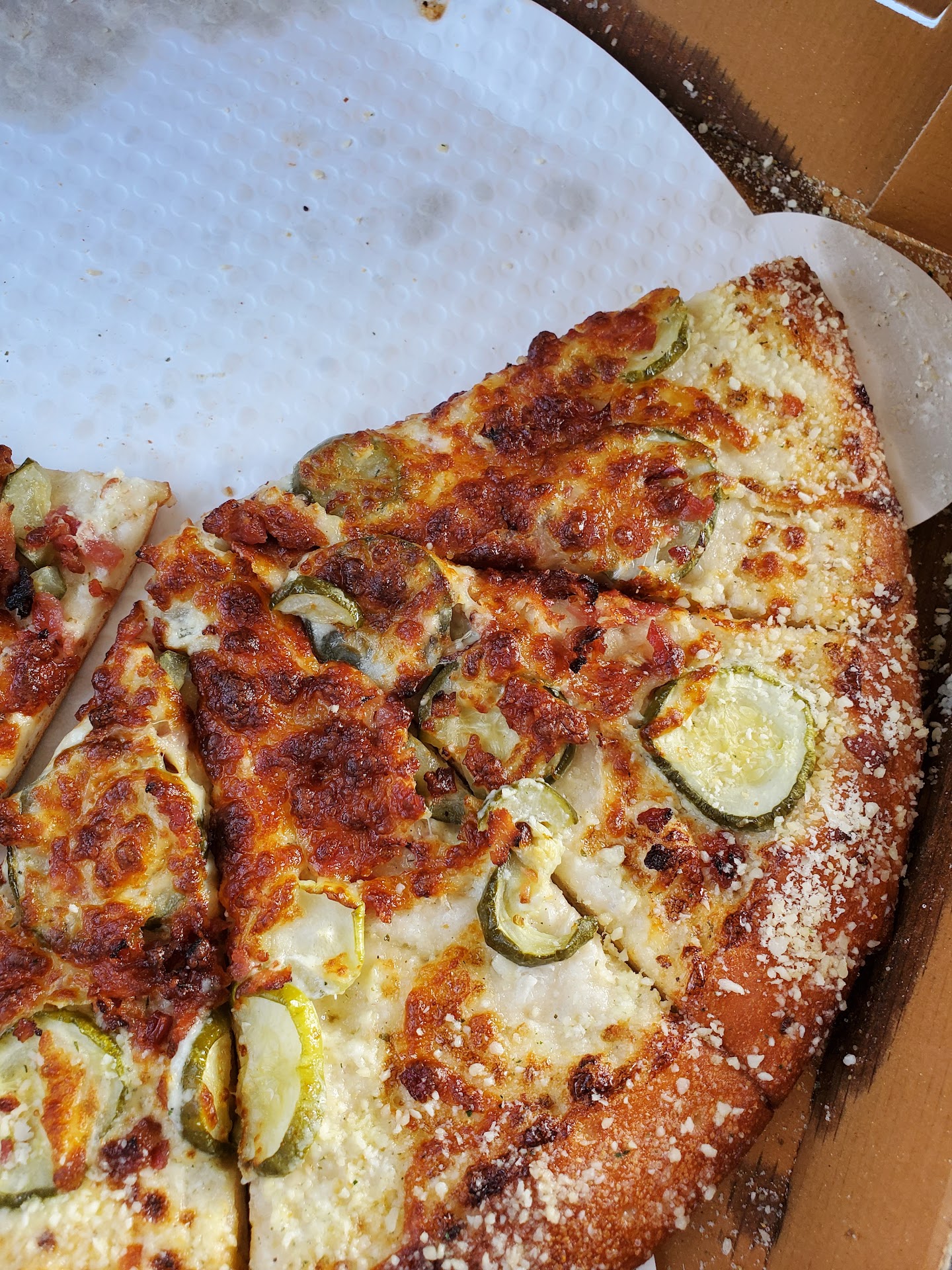 Read moreFirst off, I'd like to say I LIKE BC Pizza. I've ordered from them several times, in Boyne City, Gaylord, and Mackinac City. Never been disappointed. However, today I ordered for the first time at the Petoskey location... also... the last time. I ordered a Dill Pickle Pizza, with extra white sauce, extra garlic crust, added bacon, well done. Aside from the "well done" part... everything else was wrong, as you can see in the pictures. It either had ALMOST no sauce, or flat out NO sauce. I picked up the first piece and everything just fell off as I picked it up. In one of the photos I pressed my finger into the top of the pizza to illustrate that it was just gummy plain dough. The pizza also had NO dill on it whatsoever, as well as NO garlic on the crust. I tried my best to illustrate all this in the pictures. I basically got plain dough, with some pickles, bacon, and a little bit of cheese and parmesean on it. It tasted like white bread with salt on it. The whole point of dill pickle pizza is to cut the saltiness with the sweet and savory of the sauce, which is why I ordered extra sauce and garlic. I ate what I could cause I'm cheap and hate wasting food... but... it's just... so incredibly bad. I physically don't think I could keep anymore down. A Little Ceasars Hot and Ready, in comparison, sounds like fillet mignon right now... for less than half the price. Fool me ONCE...