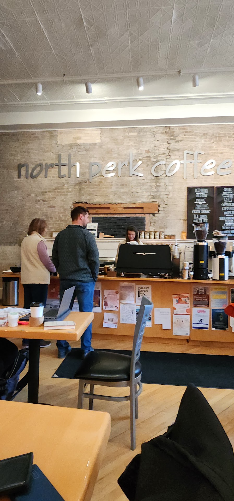 Read moreCoffee is great here, hot and frappe options, and the service is amazing. Not a ton of food options, but the toasted bagel and cream cheese and fruit smoothie were freshly made and delicious. I saw fresh muffins but neither one of us ordered one. Lots of places to plug in and work on your laptop, which is why we chose this place. Saw more than one small, leashed dog come and go, so they may have a dog friendly policy, but I would call ahead to verify. Was very quiet when we arrived about 10:30 am got a lot of work done, but from lunch hour on the place was hopping! Mostly a young crowd but some older ones like us were there, too. I highly recommend North Perk Coffee, Petoskey for amazing coffee, food, service, and great atmosphere to enjoy getting some work done while drinking your...