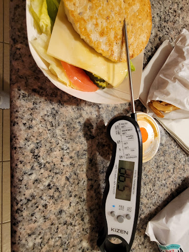 Got our food. The fry's were soggy and the burger was small, equivalent to a Whataburger Jr. or 1/4 pounder from any other in the industry. I would even venture to say it was less than a 1/4 pounder.