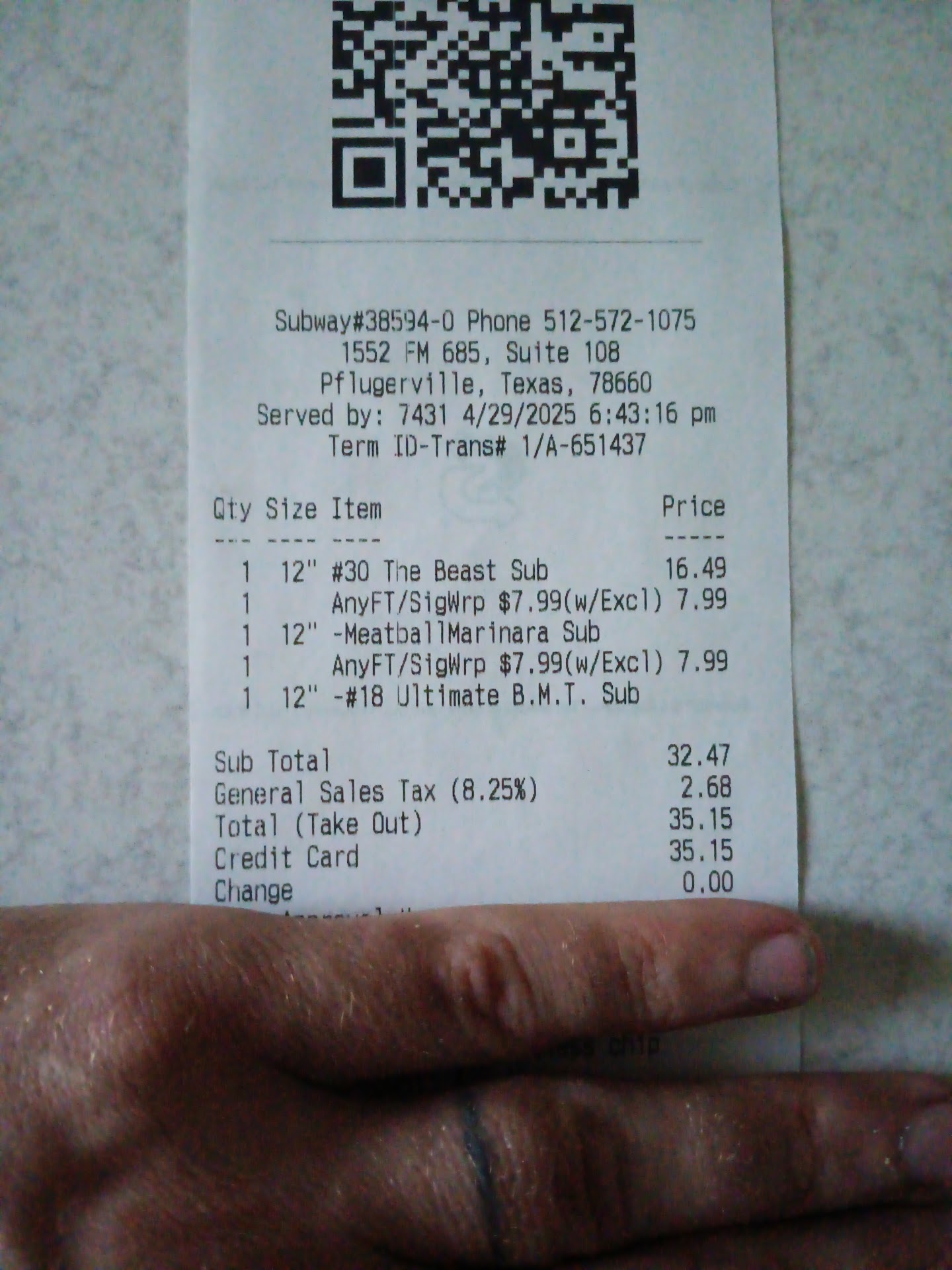 When I got in my car I realized I was charged for a footlong meal (which was actually my 6-inch) and an additional wrap — even though I never asked for a wrap. When I questioned it, no one working knew how to issue a refund. One of them (the new employee ) called the manager and handed me the phone. After 20+ minutes of back and forth trying to void the transaction, I told them I just wanted my money back and didn’t want the food anymore.