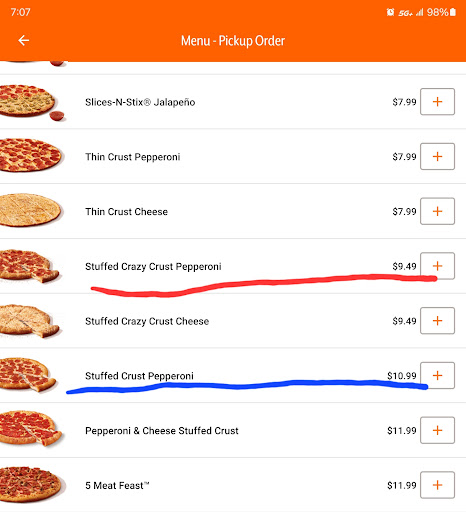 Ok, help me with this. Online it has the red underlined and the blue. So instead of ordering Online, I went down to the place to ask what was the difference between them both cuz I couldn't get the price. They explained to me that the red one comes with parmesan cheese and the blue one has none. I said ok so that's extra right. The guy couldn't explain so he called I'm guessing his manager and she said yes that's extra... so then I said ok so if that's extra then explain to me why the price. I said, u telling me that after adding extra it doesn't go up in price but down and the regular is more expensive than the one adding more... I said, oh dang I hope every restaurant for example Whataburger lowers their price when I ask for extra cheese and bacon. She laughed and said sorry sir. I said, ok then give me one of those but on 1 don't add parmesan to it, she said I have to cuz like when I go to McDonald's and ask for no cheese and want it at the cheeseburger price they say I have to have it with cheese. I said hmmm that's odd but ok if that happens just say put it on the side... she just looks at me and says sorry we can't do that. I still paid and she turned to the guy that was helping me and whispered, but I heard, that's why it's online and we don't do that here at the store's and walked away. I said, so she could hear me, I see u don't have it here in the menus behind u, but what if I were to come here as I did walked in, and said I want stuffed crust pizza with parmesan cheese drizzled on the crust. Would u say oh we can't do that or would u tell them it's in the app so u have to order from there knowing I'm right here right now... or this, what if he or she don't have a phone, which it's no possible but phone illiterate and does everything in person like I do. Would u screw him or her on that and charge extra or turn them away. The guy just looked at me and said I'm going to look into it. So in all u will see that I bought them differently. Stupid...
