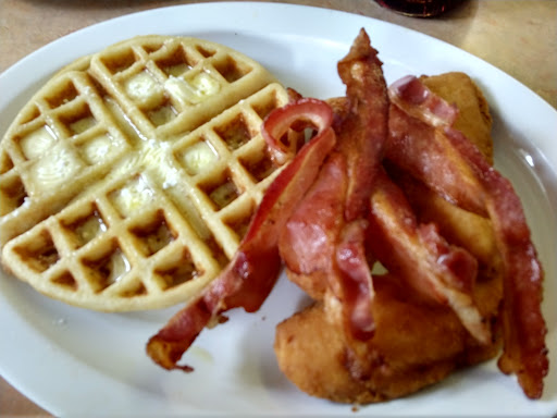 This is my first time trying them to dine-in because I've order for take out or grubhub. With entry, it's very small and has a classic feel to it which can be good or bad depending on the consumers. Tip/suggest: this place is great for couples with a small child or two. The waitress greeted me with a menu and ask for a drink. I ordered three stack pancake with bacon and eggs with cheese. Also and order of homemade toasted bread. Most breakfast spot around the neighborhood are the same but this spot is a bit different. It felt like my cousins down south made this breakfast but it's missing variety to make it special. The bacon was pre-cooked (obvious) but the eggs with cheese was made light scrambled and I can taste the cheese. Pancake taste reminded me of crackle barrel which is good but I'm missing variety of toppings. The place can be a hidden gem but need more space and variety than the...