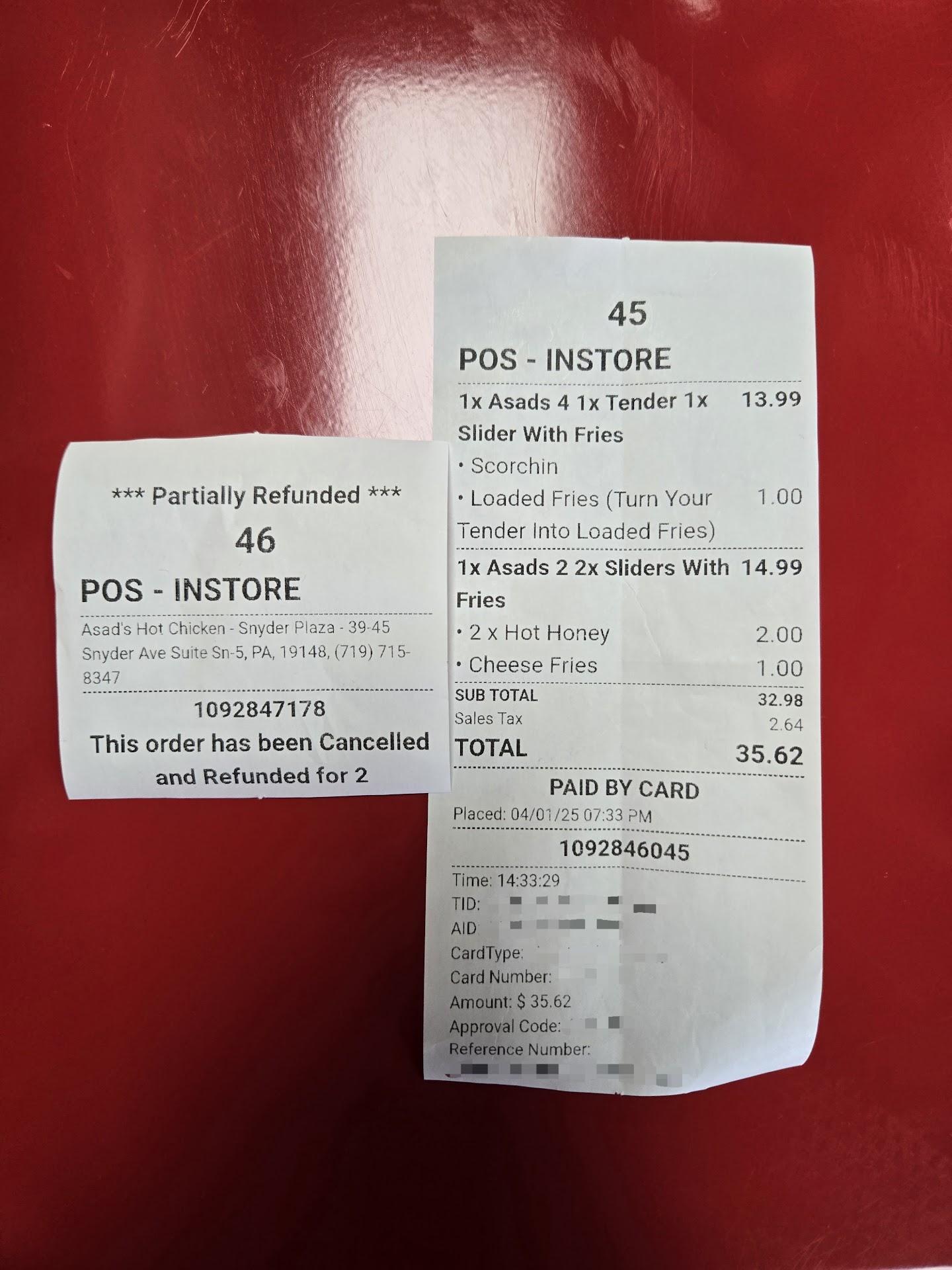 Also, be careful if you do end up doing refunds. They LIE and don't issue them!!! So after confronting them about the extra charges for the hot honey sauce, I asked for a refund to which their manager went to the machine and did the refund. But he didn't do it at all. What he did was he did a new order and gave me a recipe that has a completely different order# and transaction# to what the original order/receipt was. There was no credit card # or anything on that receipt. The funny thing is that the new receipt says, "The order has been canceled and refuned for 2." Upon reading that sketchy message, I confronted the manager about it, and he assured me multiple times it has been refunded, to which I asked what if it wasn't? He would just say it has been done and I will be refunded. He lied, and I never got a refund from them. Just so you know, I ate at Asad on April 1, and I waited until April 15 before I disputed. So, be careful and check your bank for the refund. If it's not there, I would highly suggest you dispute the charges with your bank.