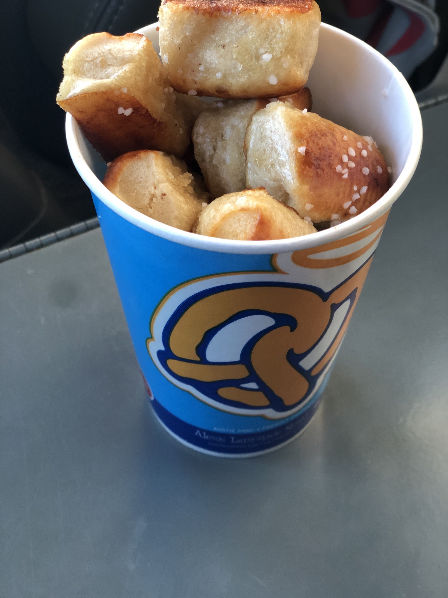 Read moreI just wanted to say I loveeee Auntie Ann’s so much like honestly y’all should sponsor me but, never the less I digress. I ordered a large pretzel with a regular lemonade which made my total to be around 8:30 but than the pretty girl at the cash register suggested I get honey mustard and try it with my pretzel. I’m glad I did it was delicious. The girls working there were really nice and...