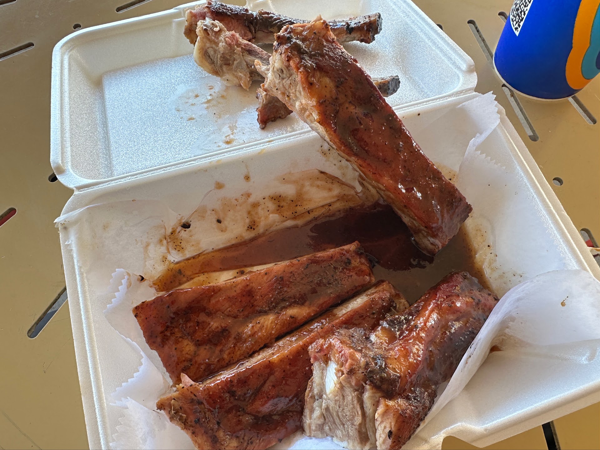 Read moreIf not for the ribs i had the 1st visit id. rate a 1 star. I Decided to try the chicken this time. After waiting about 20 min im called to get my order. I go right to the table to eat and it was obvious the chicken was not freshly cooked. It was luke warm and did not taste at all like it was cooked on the charcoal grill. Also the greens were also luke warm and the mac & cheese was just noodles with a Lil bit of cheese. I took it back to the truck to tell the cook and the cashier comes over with her thermometer and rudly says this chicken is not cold! I responded it is clearly not fresh off the grill hot for sure! She takes the meal from her cook, didn't offer to remake it and just handed me a partial refund. For me service is everything..im not sure which was worse, those steroid injected oversized non grilled pieces of chicken or the cashiers attitude but they will not get another...