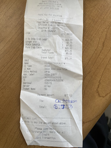 Food is always good. Drinks are always good. Was one of my favorite places to go and get something to eat. Unfortunately I have to give 1 star because I had the number one thing you just dont do as a server happen to me. My check tip was edited ( an extra10$ ) honestly it doesn't matter how much it was edited by is the fact that it happened. As a current mananger of a restuarant and prior server, it disgust me that servers have the audacity to do that. I completely understand the nature of the job and tips is how they get paid but editing tip changes is foul. I literally dont understand why the server decided to do that cause it was only me and another person I was with. We order food and a couple drinks. I never was rude , I used my manners and said thankyou everytime. Bar bill came to 20 and some change. I tipped 20% and that's 6$. Unfortunately I called to try and get a copy of receipt to make sure I was not mistaken but it was a hassle to get a receipt..then I had to explain why I needed a receipt and the person whoever answer the phone automatically knew it was for a incorrect possible tip adjustment. Ask for manager and emailed asking for receipt. Nobody got back to me. So I had to take situations into my own hands with my bank and dispute the edited tip they put on. (Not the whole charge, just the fraud tip. So benny bums still recieved my payment/business from me). Unfortunately this server thought she could get over by me..dont know why.. idk if she thought I dont check my bank statements/transactions because of how I look but I was not the one for that. "Treat others how you want...