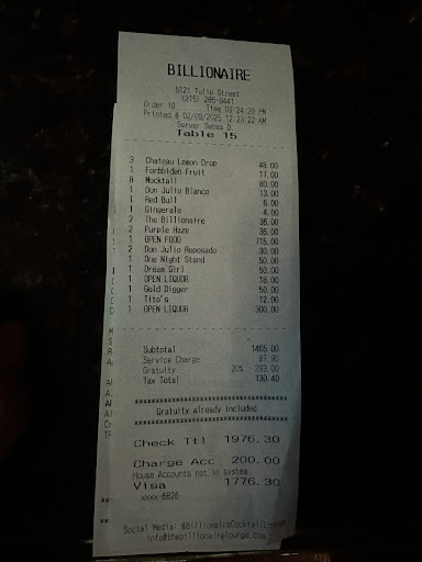 Ā Ā Ā Read moreI love finding new places and having an experience. The Billionaire Lounge is an experience! The Lounge is a nice Tiktok capture or IG picture moment with a cool vibe and nice DJ. I was shocked by the location as it is near the hood but has private parking. The music is Hip Hop/ R&B. The price stands by its name Billionaire because you will spend a few $$$. The Lounge is an upscale lounge with a minuscule menu with bites to eat and not meals! The menu is very limited yet costly for the portion size. I would suggest eating before you go with the intention of having a quick or little bite there. For 3 gulf shrimp and fries, I paid $17.00, and for 4 mini filet mignon eggs rolls (fancy way of them saying cheesesteak egg rolls), I paid $20.00. My person and I looked at the portion size thinking of these kids or adult portions for the $$$. The drinks were cool and typical for the price of an upscale lounge. As previously stated, the decor was nice and photo worthy for some good captures. The atmosphere is a fun date night or girls' outing. They do have bottles priced at 300 and up šµāš«. But honestly, by the time you buy a few drinks, you would be close to paying for a bottle anyway. The hookah was 75.00 but unlimited coals and worth the cost because it was super smooth. Would I go back again... maybe for some drinks or a girl night, but this would not be something I would do on the regular. I would probably go once again for a birthday...