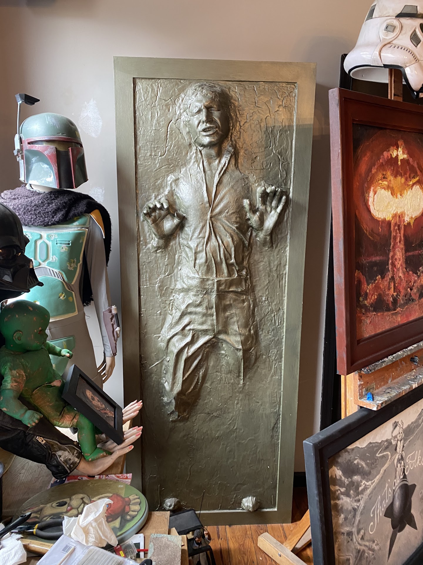 This is my new favorite place. The only thing better than my inferno burrito which was amazing and yeah had decent 🔥 was the life-size working battle droid we all know as R2-D2 (Created by the owner!) In addition the entire place (2 floors) is covered wall-to-wall ceiling -to-floor with retro, sci-fi style artwork that of which was also 90% created by the owner himself! It gets better, on the second floor is a life-size or close to, Han Solo encapsulated in Carbonite. -One more notable mention, The staff may be the most welcoming staff I’ve personally experienced since living here the last four...