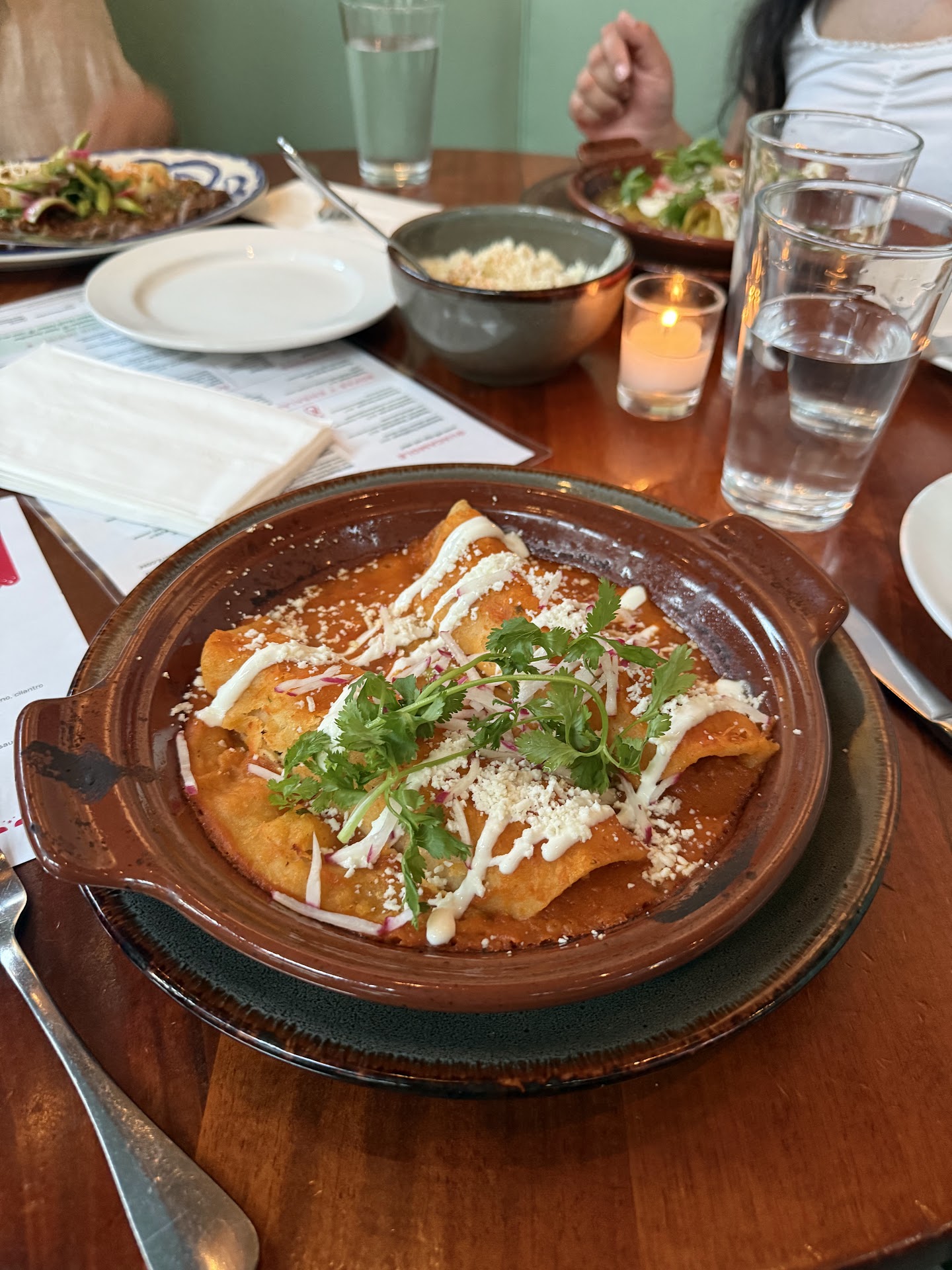 My vegan friend got the Enchilada con Granos (grains). First off it was a very amber color, although the sun was setting so it was hard to tell exactly. Filled with farro, red quinoa, yams, mole amarillo. Seriously, I didn't miss the meat. I wished I'd got that myself.
