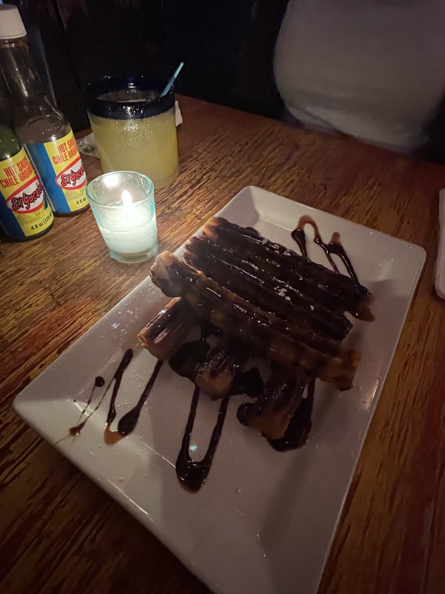 Now onto the food!!! Elote-I was only expecting one but instead received 2 nice sized corns that had the perfect taste and the right amount of everything on them with a perfect grilled taste to them as well. I was told that the Chimichanga was different but still good. I had the crab taco, and OMG let me just say this will be my go to place for some good Mexican food. Everything tasted so good; everything had flavor and tasted like something. The churros were good, wished the chocolate came on the side m, instead of drizzled all over them. Our drinks were really good, we really enjoyed the pineapple and mango...