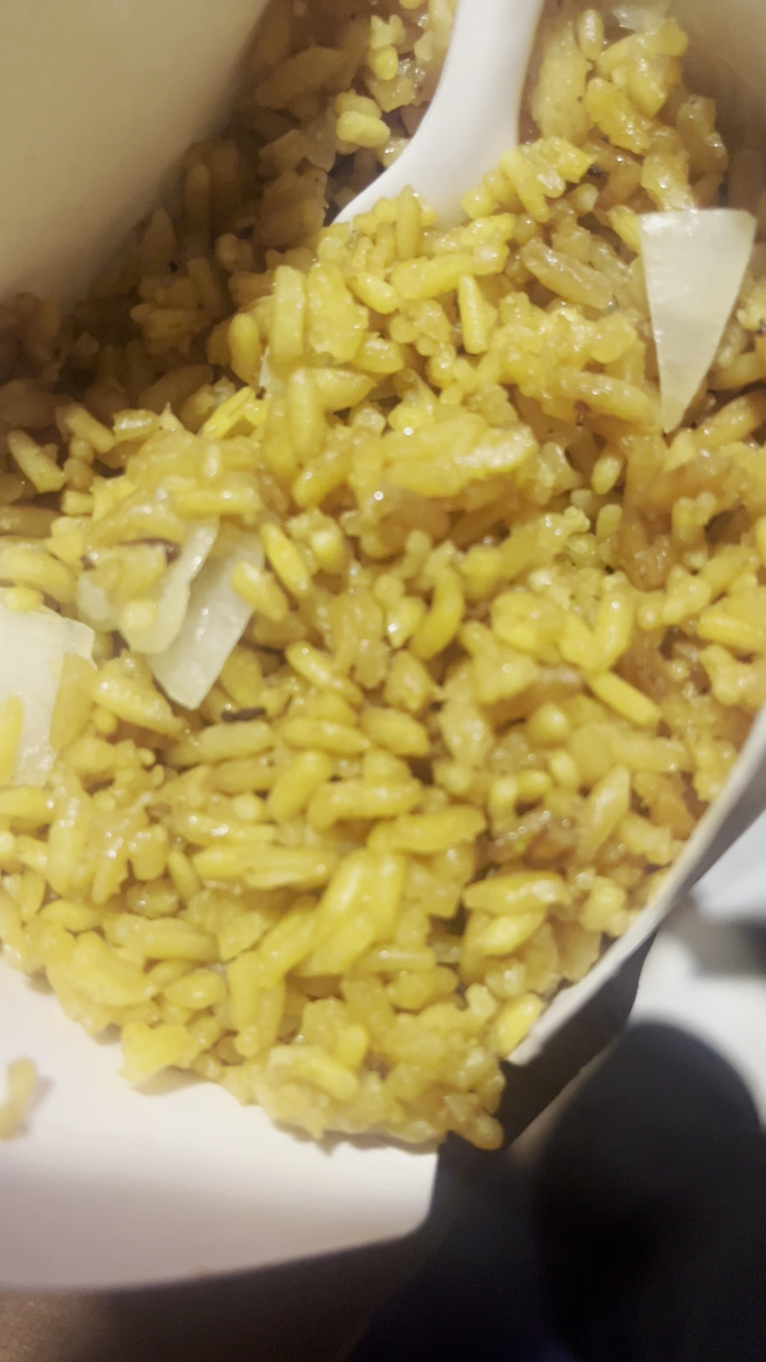 Chicken fried rice - rice uncooked. Chicken in huge piece, plain white, not been marinated at all. So chicken was in huge slices of super white tasteless pieces. Only some bean sprouts were given with none other vegetable. No egg.