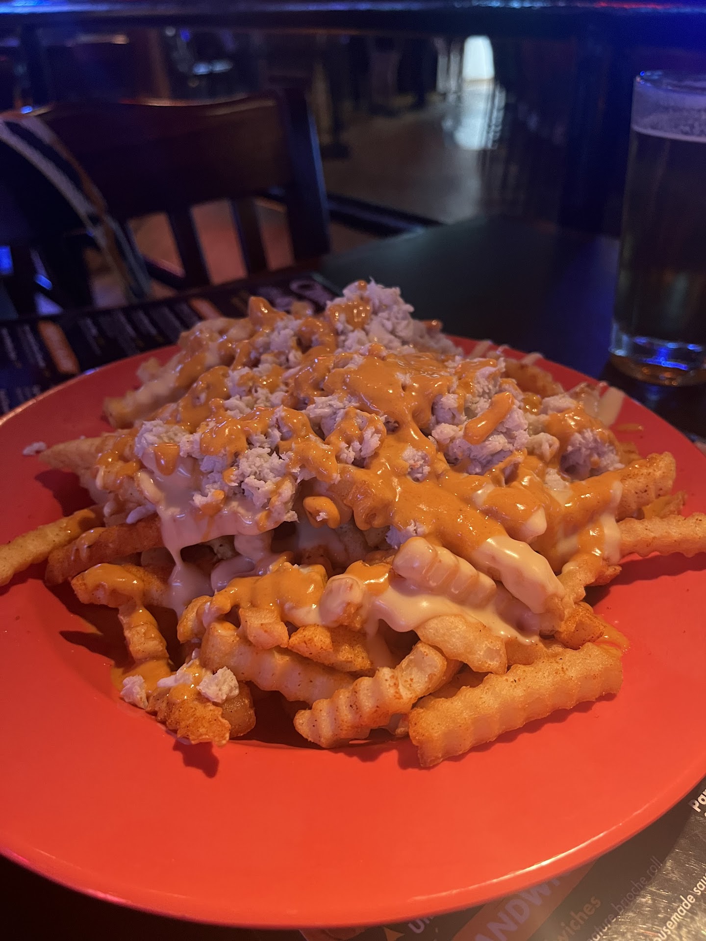 This was my first time ever going to Chickie & Petes!! I always get crab fries at all of the stadium events or whenever I see the food truck. I've always wanted to go but Never made my way across the bridge. I was in the area so we stopped in to get Dinner. Went in to get a table(It was at a busy time) Hostess was kind of Confused...I tell her my name and give her the number of people she looks at me and asked "Did we text you yet?" I said I am giving you my information so that I can get a text..... We wait a good 30 mins... Which isnt a problem...It was a Dinner Rush.... We get seated.... We wait for over 10 minutes for our waitress to come to our table to get our drink orders in(again not a problem it was busy). She drops the Drinks off but doesnt ask did we want to put an appetizer in so we wait some more. My drink(a pomegranate Margarita) was practically juice!! I did not get a second!! Meanwhile the Music is ridiculously loud!! You can barely hear yourself think let alone hold a conversation. Even my 11 year old said it was giving him a headache.. The waitress comes back and We put the appetizers orders in. At this time we were told that The food comes out as it is done. So we ordered 2 appetizers but they both didnt come out at the same time. Okay not a problem... We put our food order in.. I ordered the Buffalo Chicken Sandwich, My son ordered the Lobster Cheese Steak and my Husband ordered a burger. We got Crab fries for the table. The Crab Fries come out first. They were absolutely seasonless!!! There was hardly any Old bay... They were so lightly seasoned with old bay that you may need a magnifying glass to see the specks. I have never had Chickie & Petes Fries that werent full of Old Bay!! Not these fries... My neighborhood Sopranos puts more Old Bay on their fries when I order out at home!! SOooooo Disappointing!!! So we have the fries for a good 10 minutes before the food comes out. And when I say food I mean just my sons Lobster Cheesesteak. Which he did like but he said the Lobster was a lil chewy. Another 10-15 minutes goes by before I get my Buffalo Chicken Sandwich.....Which was great!! Good Portion but too much Buffalo sauce which I expected that was okay though. Another 10-15 minutes before my husbands Burger comes out. Which he also enjoyed. The only issue is my son was sitting bored because he was done and I was practically done as well. Our table was ready @ 5:15pm, we didnt leave until after 7pm. If the food all came out at the same time maybe people wouldnt have to wait so long to be seated because the table would be done all at the same time. I overheard someone say they had to have there time bumped because they wouldnt seat them if the whole party wasnt there. How is that fair? You get to give me my food at different times so what difference does it make if 1 person in my party is running 5 minutes late? Here nor there, I had my Chickie & Petes experience and I guess its a 1 and done kind of thing... Although me and my husbands sandwich was good we will not be back.. It was a major turn off... I have attached the Famous Crab Fries... Minus...