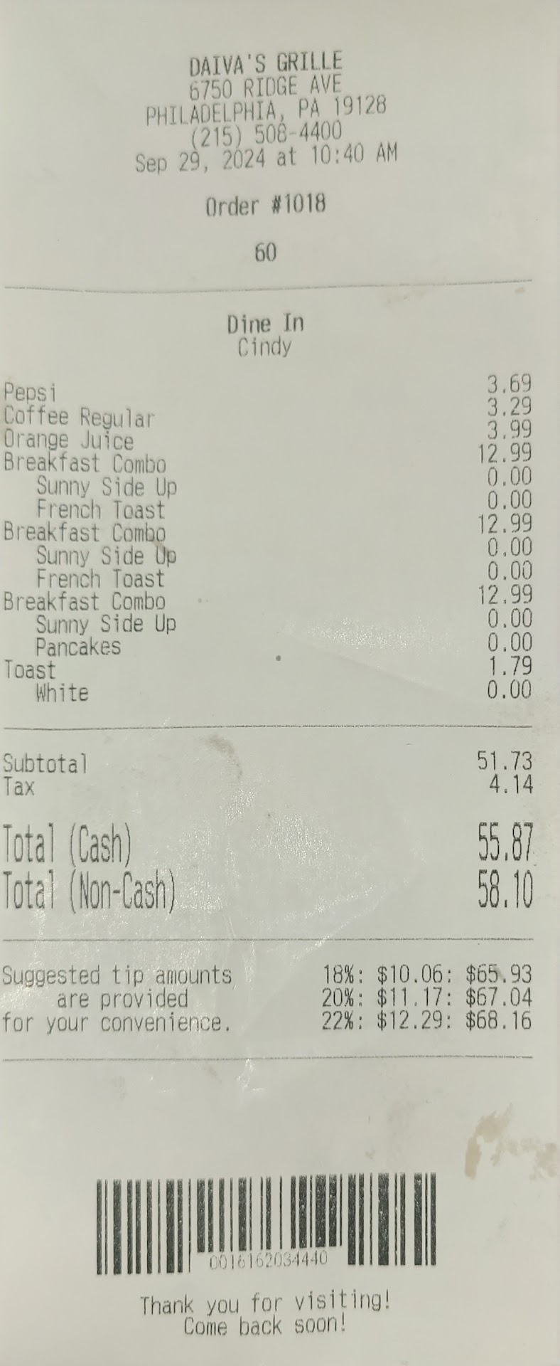 Read moreUsed to love this place for a Sunday morning " nobody feels like cooking " breakfast . This morning was a first time in a long time, and will be the last time for a very long time. For a Sunday morning around 10am , it wasn't crowded at all. Lady took us 3 right to a booth , and that's where it started heading south . Had to wait to wipe the syrup and trash off the seats , then right into the waitress with an attitude. Got asked 3 times if we're ready to order while we are still taking jackets off and opening menus . Get through that in one piece , all the while looking forward to our breakfast platters . Disappointment comes with the delivery of three plates of overcooked sausage, bacon, and potatoes. Honestly preferable to the vastly undercooked eggs though. Now the French toast??? Perfection ... go figure. The final straw is the bill . I've never seen this but there's 2 totals ...one for cash , one for cards ... like I'm getting gas or something smdh ! I usually tip in cash , pay with card but not here . It's actually cheaper overall to pay the 2.50 fee to use their ATM to grab cash and do everything cash . Next week we're heading down further and going to Andy's. Got more than a few good memories here but its not that...