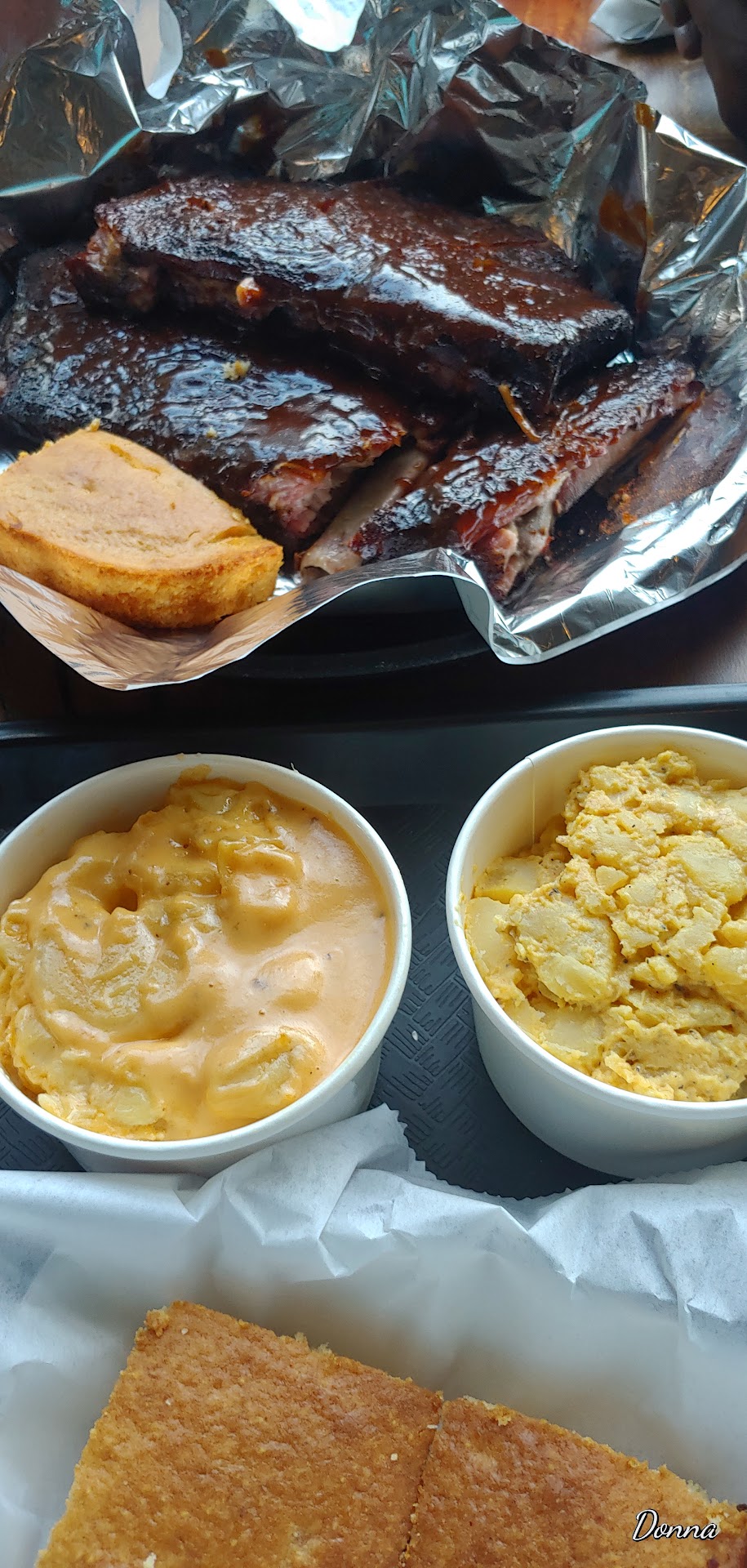 I ordered Pulled pork. Baby back Ribs. BBQ chicken. Beef brisket. Mac and cheese. Coleslaw. Collard greens. Potato salad. Peach cobbler. Nilla nana pudding. And Corn bread.
