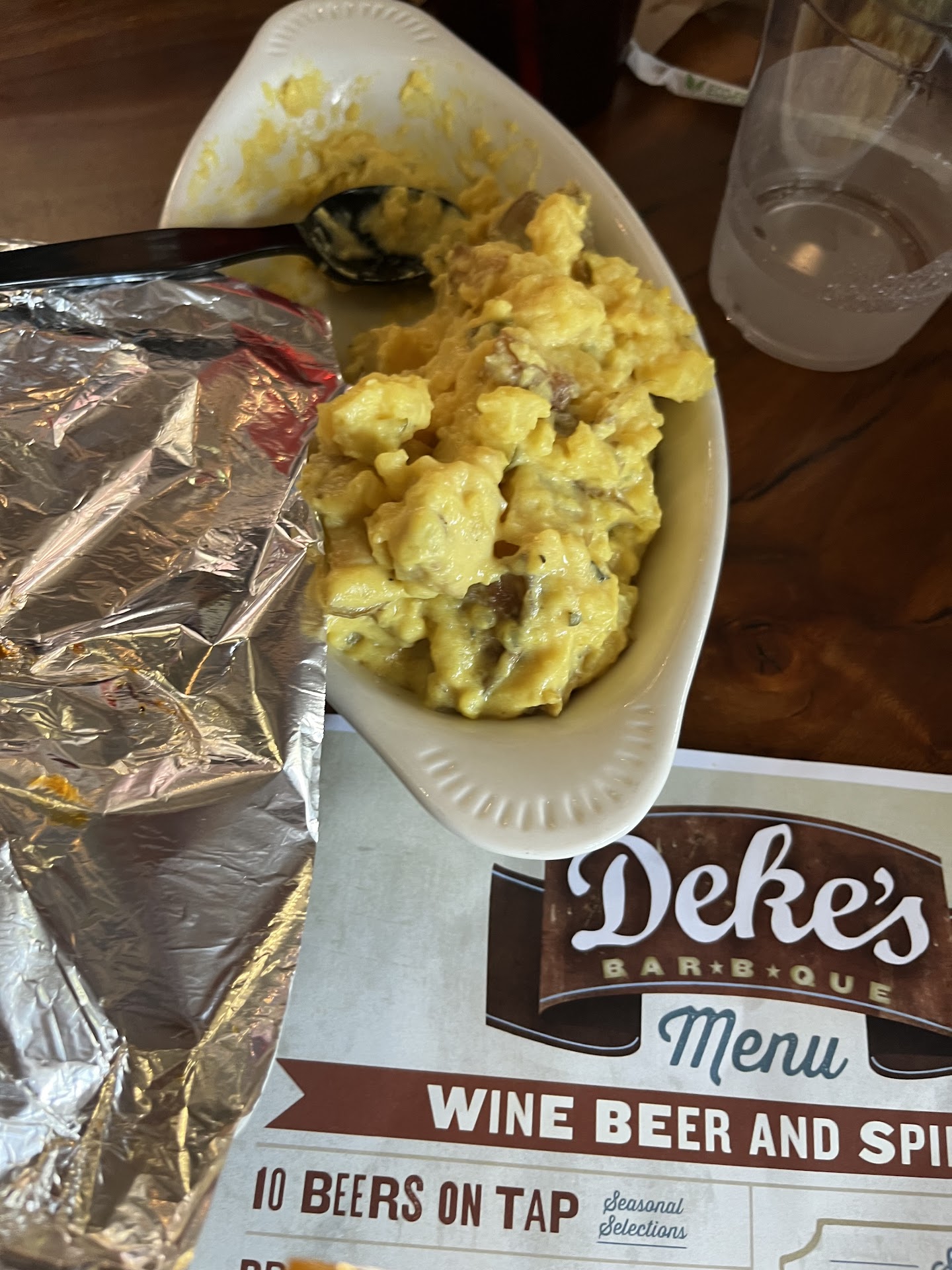 The potato salad. Not the best. Not the worst. Right there in the land of soso. It's edible. I've had some awful potato salad. the fact that the flavor aint something you'd trash is saying something. But it was dry. They left the skin on. The potato pieces were huge. It could have used a bit more mayo just to give separation that you weren't eating lumpy mashed potatoes. the funny part is it wasn't cold. But it was seasoned.