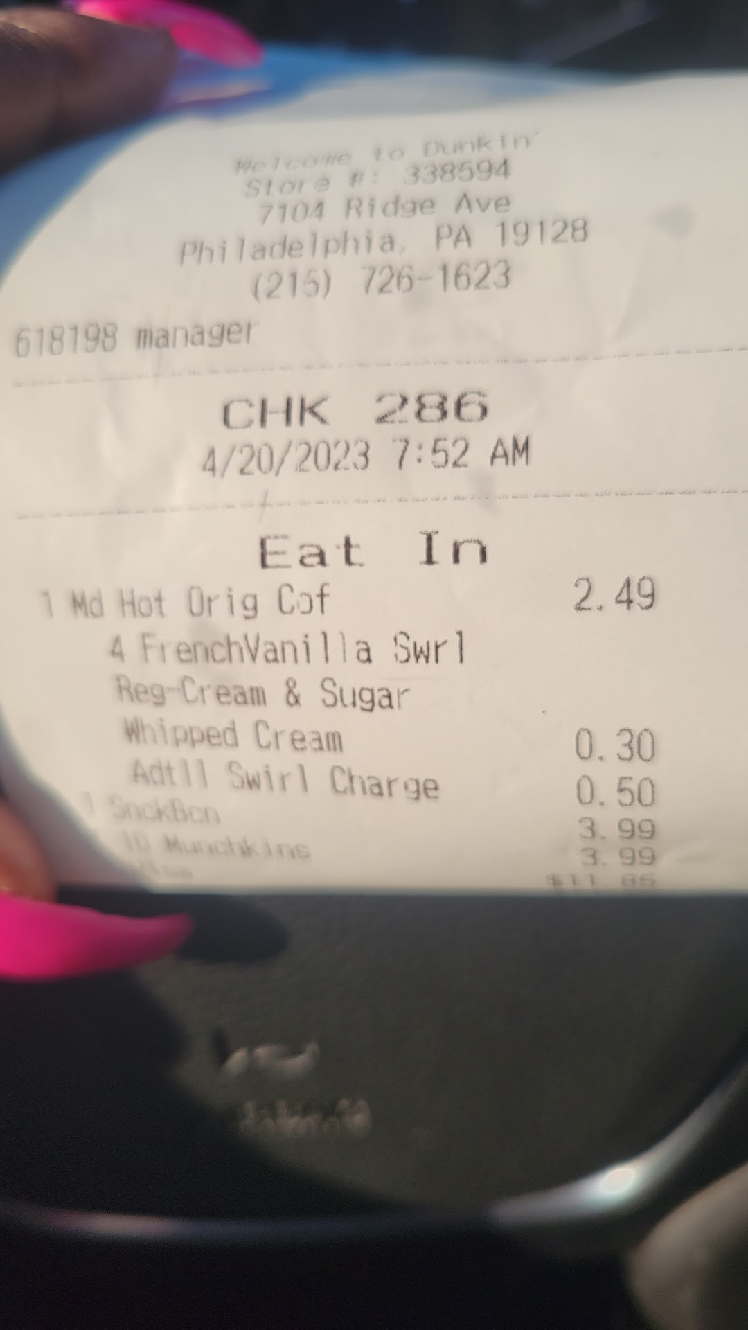 Read moreBEWARE!! THEY STEAL HERE. I CAME HERE THROUGH THE DRIVE THROUGH TO PURCHASE 25 MUCHKINS. I ASKED IF THEY HAD AN ASSORTMENT THEY SAID YES. THEN THEY SAID WE WILL GIVE YOU 50. AND SEEING THAT IT WAS LATE IN THE DAY, SOMETIMES IVE KNOWN BUSINESSES TO JUST WANT TO GET RID OF IT. SO I SAID OK BUT SPECIFICALLY ASKED IF I WOULD BE CHARGED JUST THE PRICE OF 25 WHICH WAS $7.69 THEY SAID YES. AND TO MY HARM I DIDNT ASK FOR A RECEIPT. HOWEVER, I DO HAVE ONLINE BANKING WHICH I KNEW TO CHECK AND SURE ENOUGH I WAS CHARGED $7.69 AND OTHER $11.08. I TRYED TO GO BACK AND GET MY MONEY BUT THEY WERE CLOSED. THIS WASNT A MISTAKE THIS WAS BLANTANT OUT RIGHT STEALING!!! THERE WERE TWO PEOPLE AT THE WINDOW AND I NOTICED THEY BOTH HAD VERY STRANGE LOOKS WHEN I ASKED IF I WOULD BE CHARGED THE PRICE FOR 25 MUNCHKINS....THATS THE REASON I CHECKED MY BANK STATEMENT!! GOD DONT LIKE...