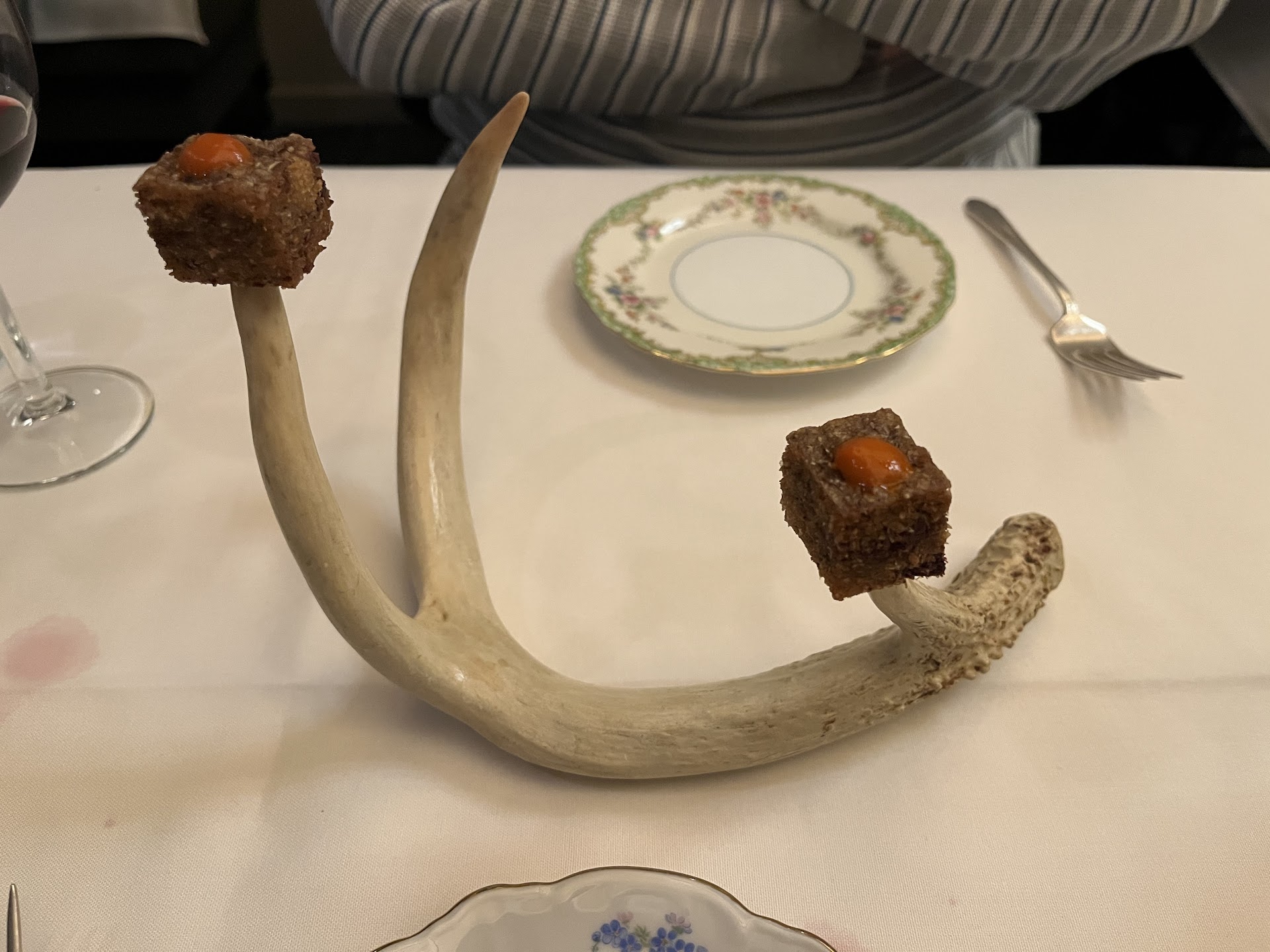 The meal started a complimentary amuse-bouche of venison scrapple topped with a pepper jelly. The venison scrapple was good, but not clearly recognizable as venison versus beef and did have that distinctive scrapple texture, which if you don't like to begin with will be unpleasant for you. We tried multiple appetizers from the snapper soup to the charcuterie to the rolls. The snapper soup was good and nice to try. If you like fish soups the turtle soup will also be a winner for you, but like a good fish soup most of the flavours are subtle and not "in your face." The charcuterie offered a rabbit liver mousse, chicken rillette, a smoked sausage, and variety of add-ons. It was all incredibly rich and delicious, but the add-ons definitely helped too.