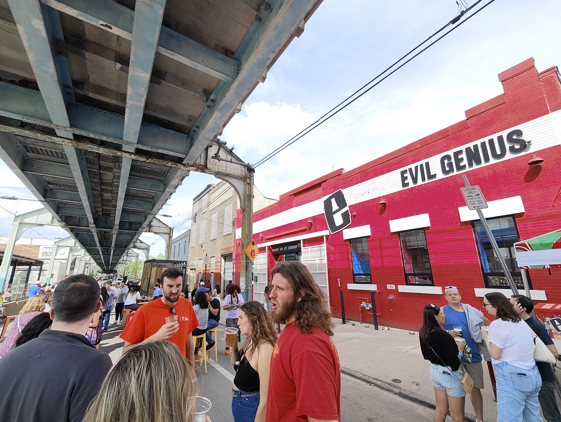 Service: 5/5. The staff at Evil Genius were great from first to last pint. When we visited, you could purchase beer at both the inside bar and an outside tent setup in the street. Both locations were quick to get patrons their order and friendly in the process. Security manning the door was also friendly as you entered and exited the front door.